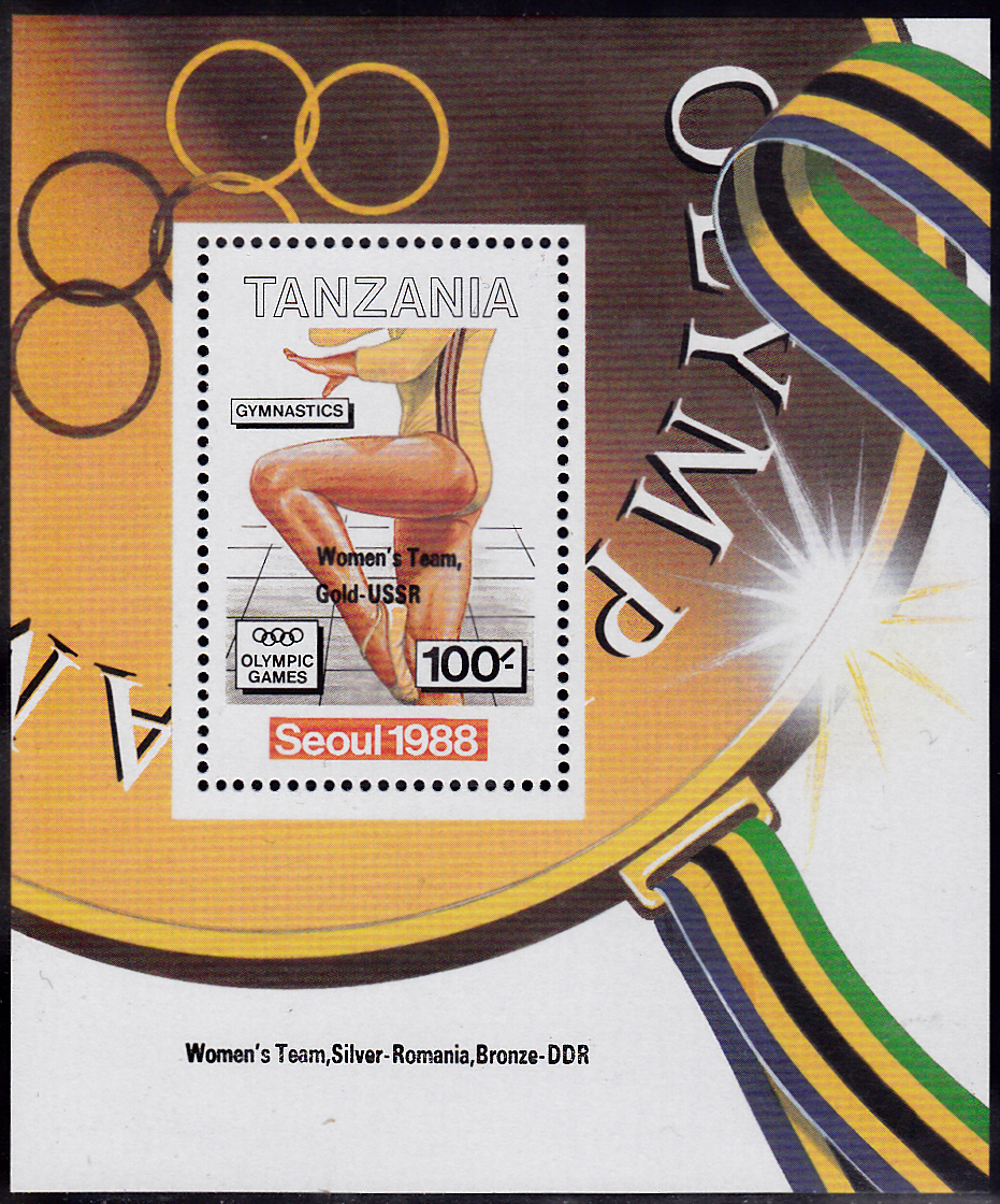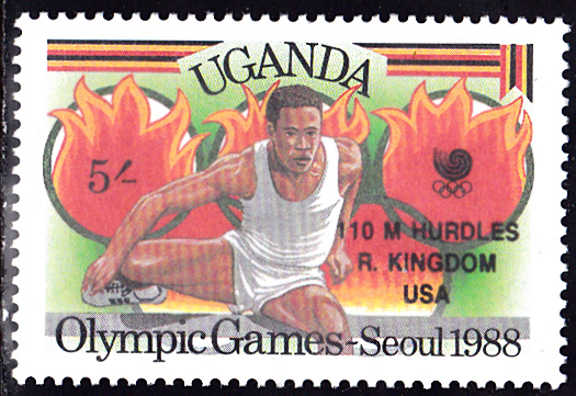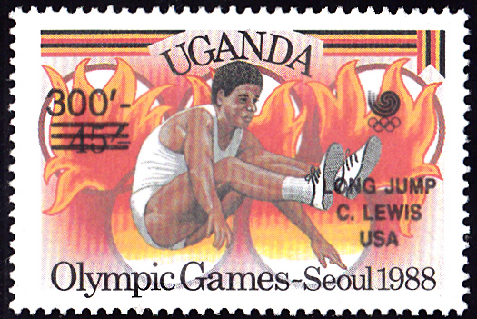 Auf dieser Marke (MiNr 641) aus Uganda wird im Aufdruck zum Sieg von Carl Lewis im Weitsprung bei den Spielen in Seoul hingewiesen.