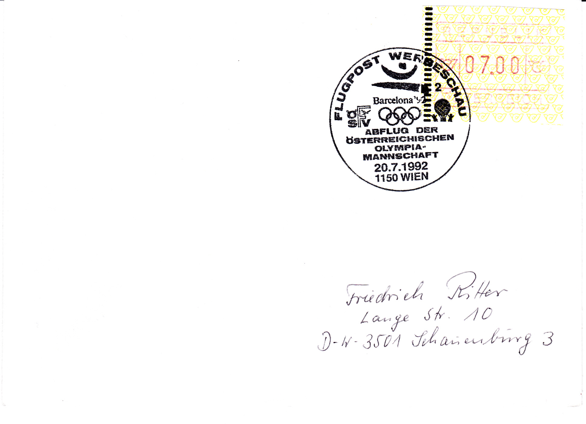 Der Sonderstempel auf diesem Brief vom 20.7.1992 aus Wien dokumentiert den Abflug der Österreichischen Olympiamannschaft nach Barcelona.