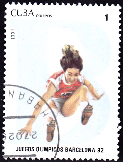 Aus einer zweiten Ausgabe aus Kuba zu den Olympischen Spielen in Barcelona kommt diese Marke (MiNr 3459) mit einer Weitspringerin.