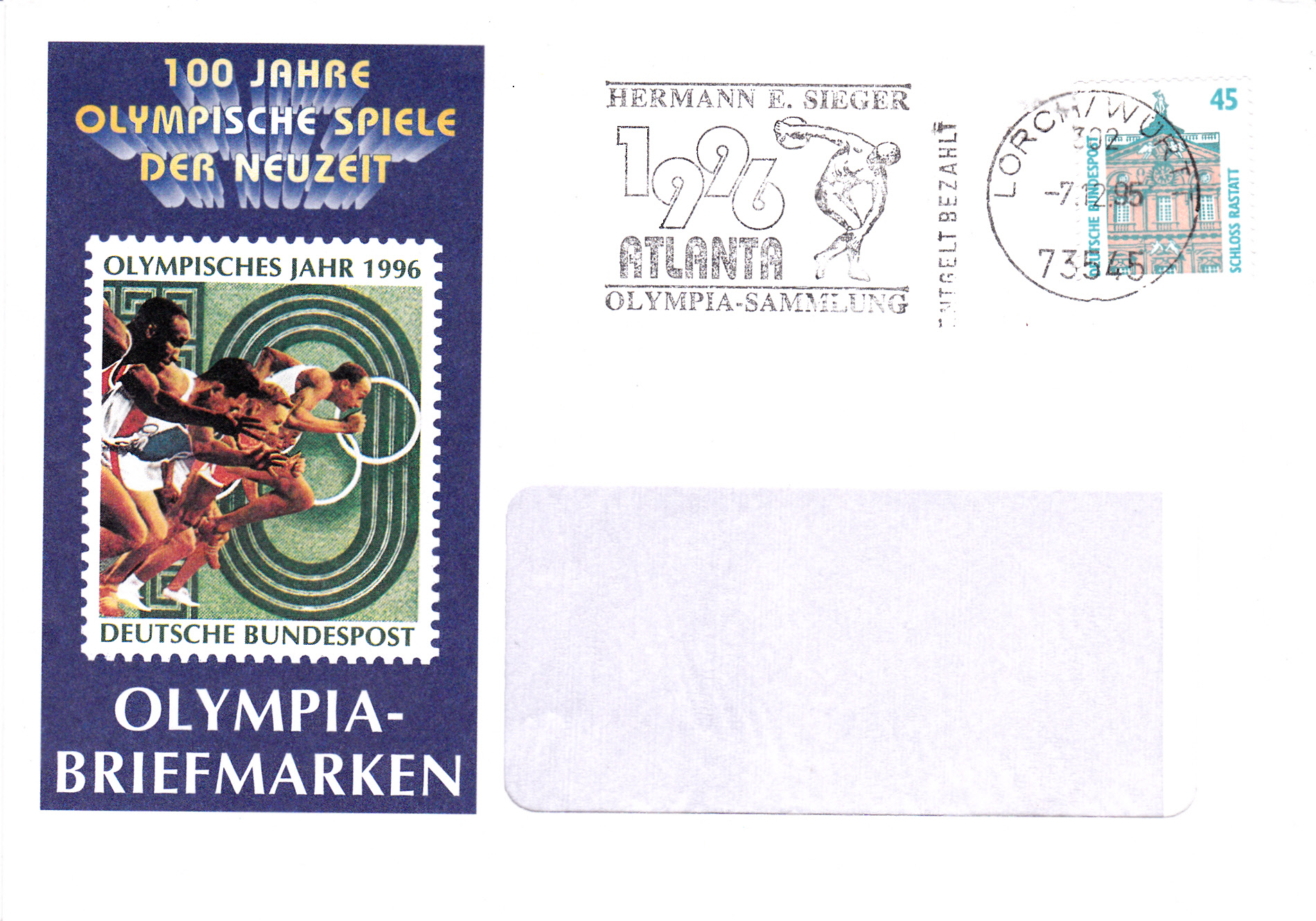 In diesem Umschlag wurde als Massendrucksache Werbung für den Kauf von Briefmarken zu den Olympischen Sommerspielen 1996 verschickt.