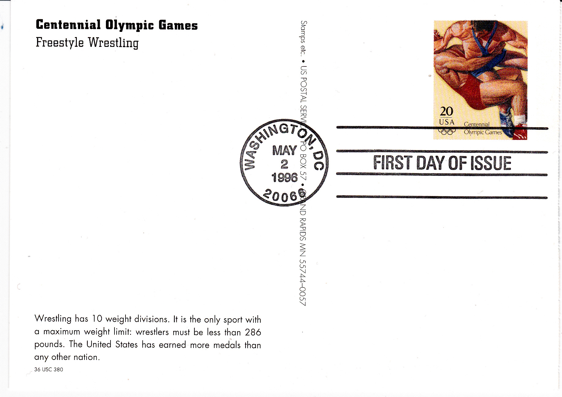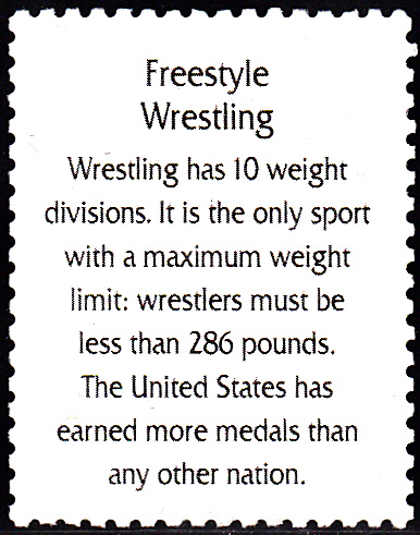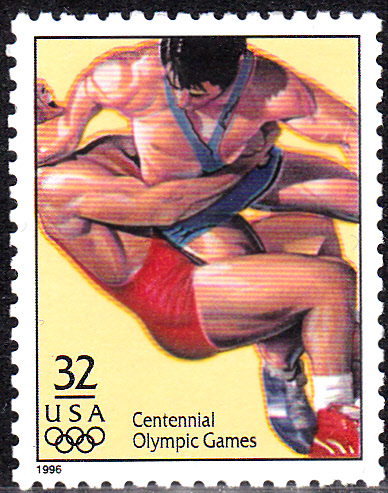 Die Marke mit der MiNr 2710 aus der Serie der USA zu den Olympischen Spielen 1996 in Atlanta bildet einen Ringer ab.