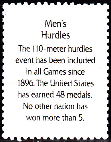 Der rückseitige Text berichtet über die Erfolge der USA beim 110m-Hürdenlauf der Männer bei Olympia (bis 1992).