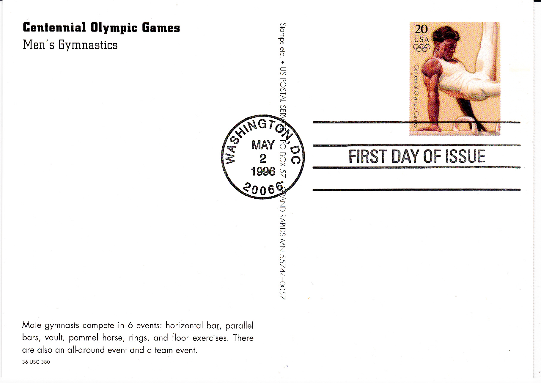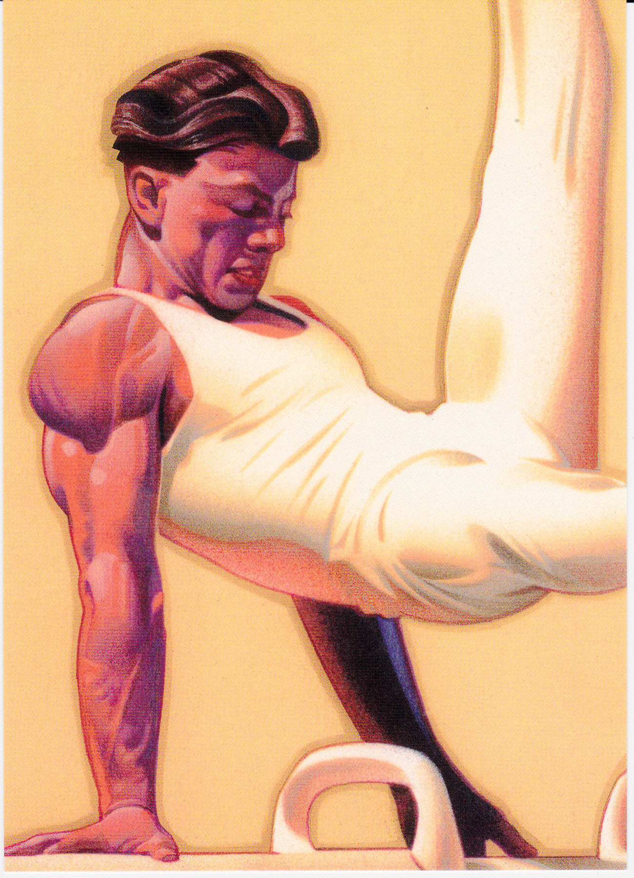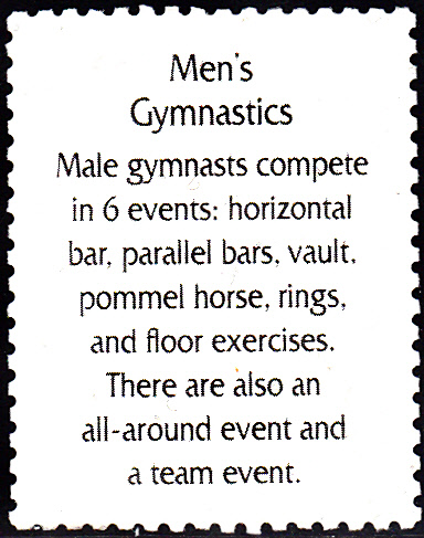 Auf der Rückseite werden die Wettbewerbe beim Männerturnen bei Olympia beschrieben: