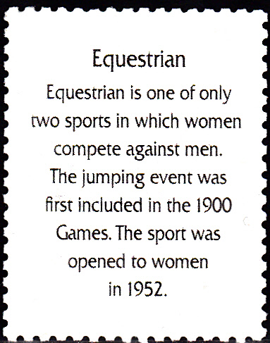 Der rückseitige Text weist auf eine Besonderheit im Reitsport hin: Männer und Frauen starten im gleichen Wettbewerb.