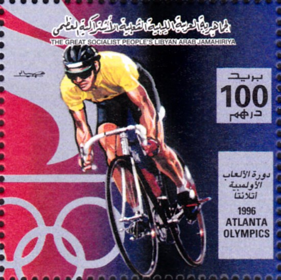 Diese Marke aus der Serie aus Libyen (MiNr 2266) bildet einen Radfahrer beim Straßenrennen ab.