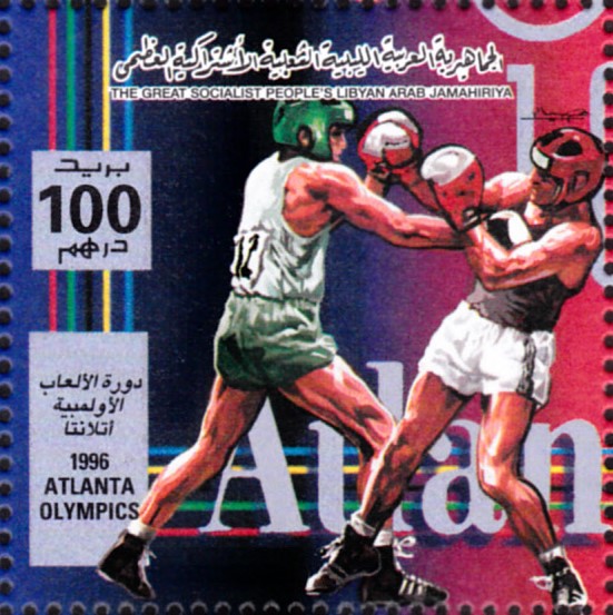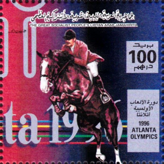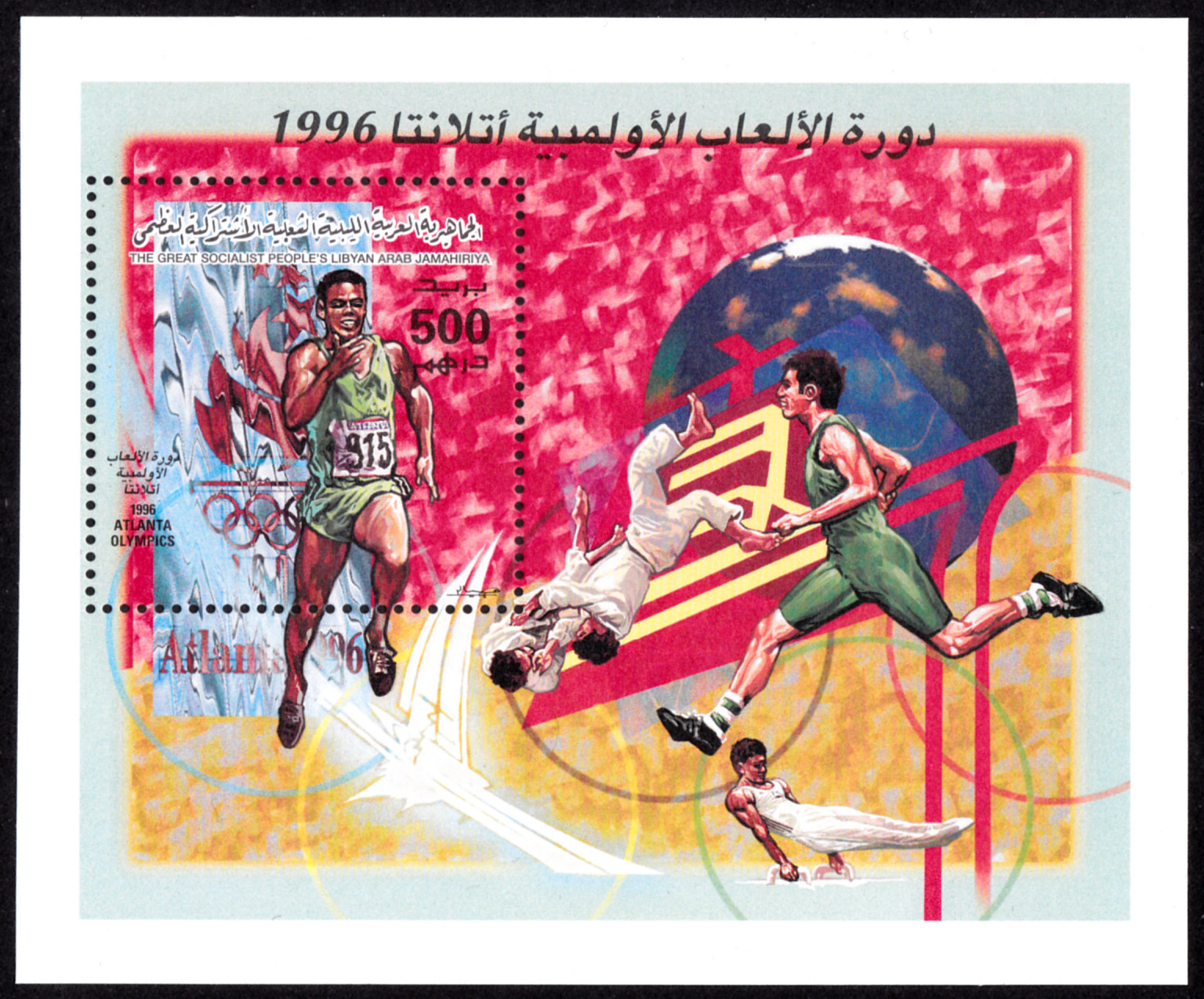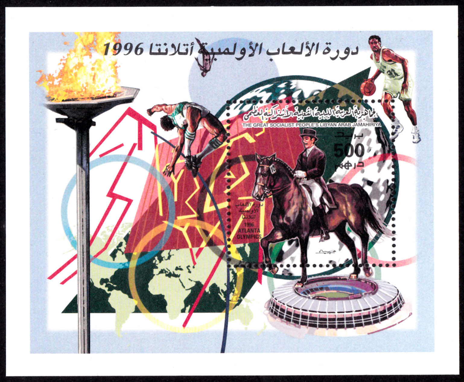 Ein zweiter Block (MiNr Block 143 mit Marke MiNr 2270) komplettiert diese Ausgabe aus Libyen. Auf der Marke sehen wir Dressurreiter, auf dem Blockrand einen Basketballspieler, einen Stabhochspringer ganz oben am Rand und klein einen Kunstspringer. Am unteren Blockrand wird noch das Olympiastadion in Atlanta gezeigt.