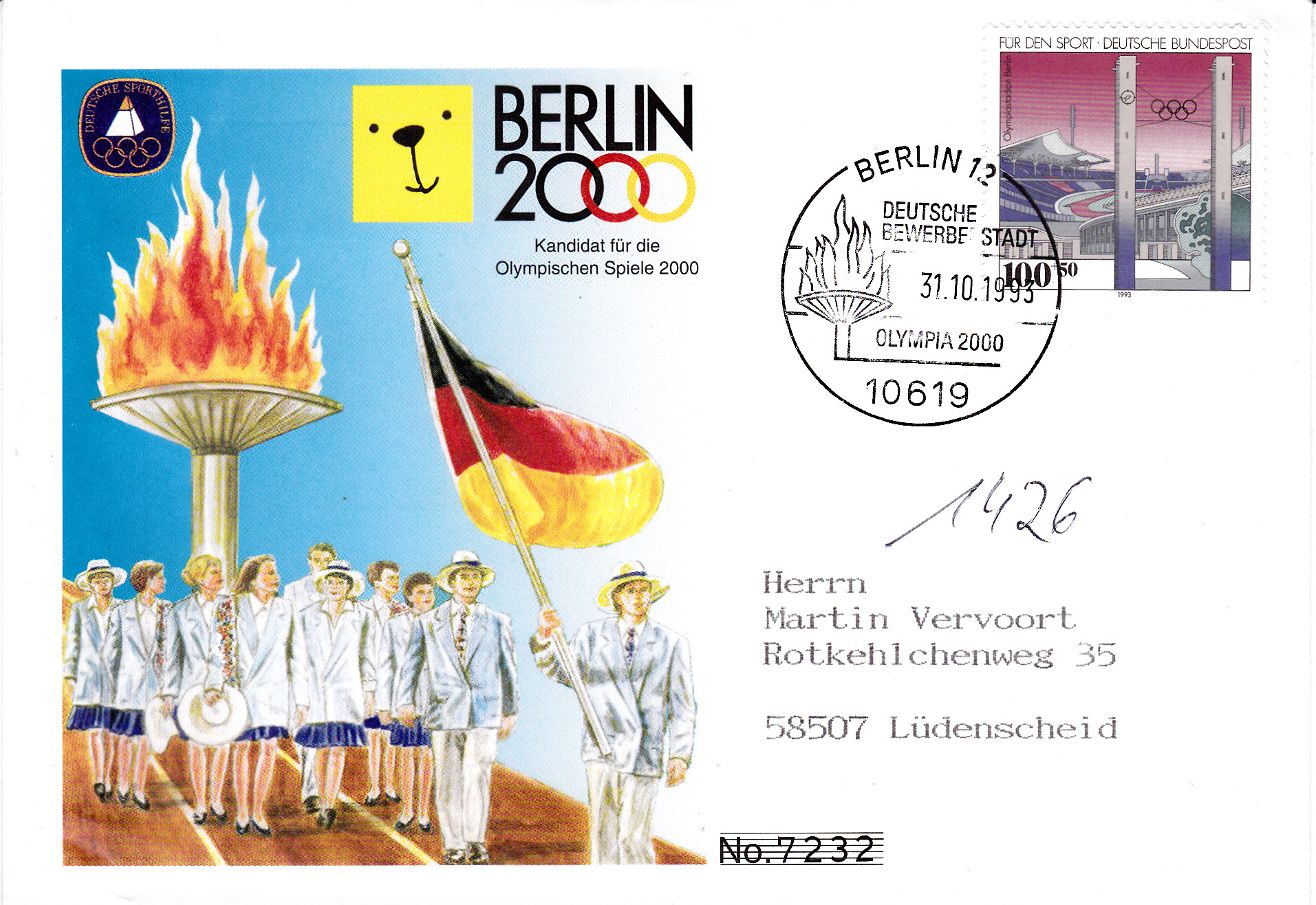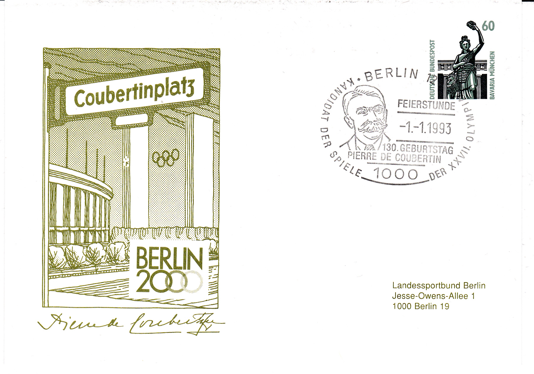 Sonderstempel vom 1.1.1993 zum 130. Geburtstag von Pierre de Coubertin auf einer Ganzsache mit Zudruck Berlin 2000. Im Stempel wird ebenfalls die Kandidatur von Berlin für Olympia 2000 erwähnt.