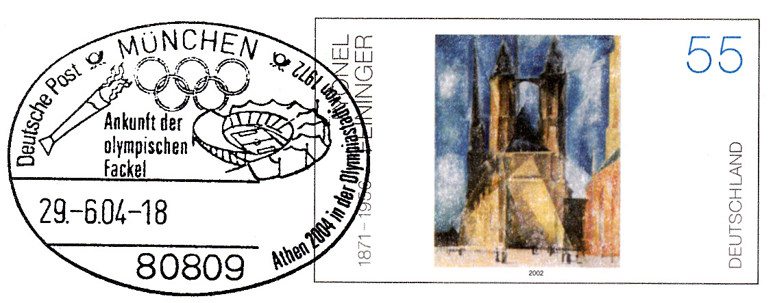 Der Olympische Fackellauf 2004 war der längste Fackellauf der Geschichte. Er führte rund um die Welt in alle Erdteile und besuchte alle bisherigen Olympiastädte. So erreichte er am 29.6.2004 auch München, wie dieser Sonderstempel belegt.