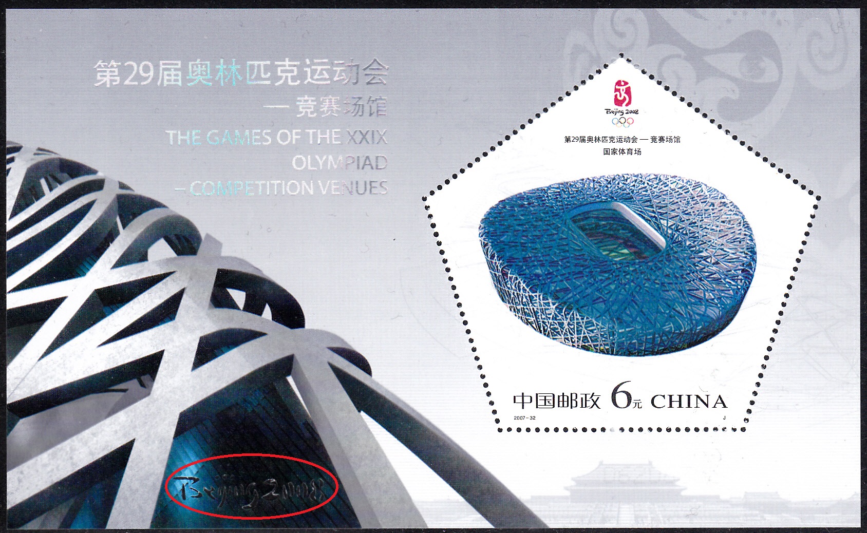 Auf diesem Ganzsachenumschlag (MiNr EA F336), einer Eigenausgabe der der DP AG - Philatelie Weiden im Format 229x114 mm mit einem Wertstempel der 145+55 Cent-Marke "Olympische Spiele 2008, Rudern" (MiNr 2652) aus der Serie für die Sporthilfe 2008 ist auf der rechten Seite des Umschlages auch das Nationalstadion abgedruckt. Da es sich um eine Ganzsache handelt, kann diese auch beim Thema Olympische Spiele Peking in einem Exponat gezeigt werden.