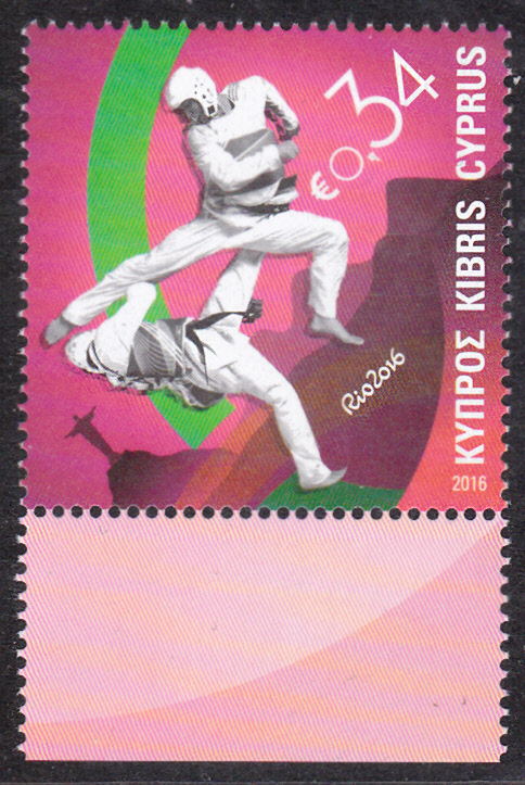 Am 11.4.2016 erschien in Zypern eine Serie zu den Olympischen Spielen 2016. Hier die Marke zu 0,34€ (MiNr 1344) mit eine Kampfszene beim Taekwondo.