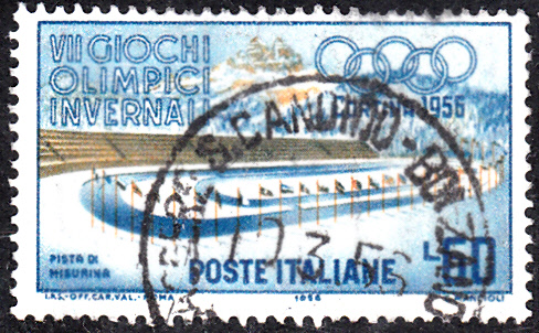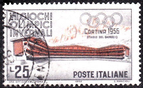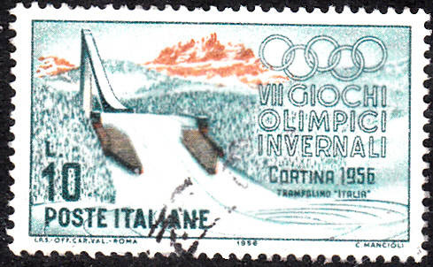 Diese Marke aus dem Veranstalterland Italien (MiNr 958) zeigt die Sprungschanze "Italia". Sie wurde 1923 gebaut und 1926, 1950 und 1955 jeweils umgebaut und im Jahre 1990 stillgelegt.