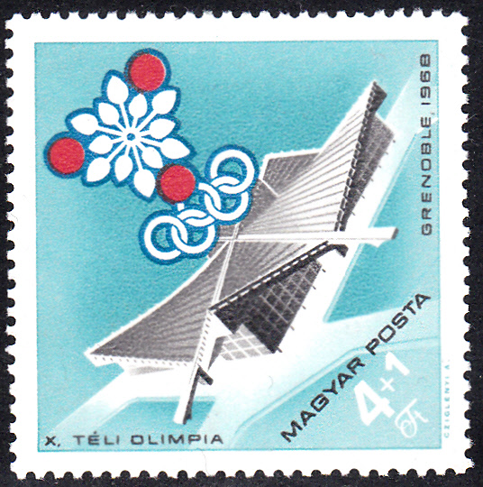 Auf dieser Marke aus Ungarn (MiNr 2386 A) wird die Eissporthalle Stade de glace (heute Palais des Sports), in der die Eishockeyspiele der A-Gruppe, die Eiskunstlauf-Wettbewerbe und die Schlussfeier stattfanden, gezeigt. Die Halle mit 12.000 Sitzplätzen befindet sich im Parc Paul Mistral, dem zentral gelegenen Stadtpark von Grenoble.