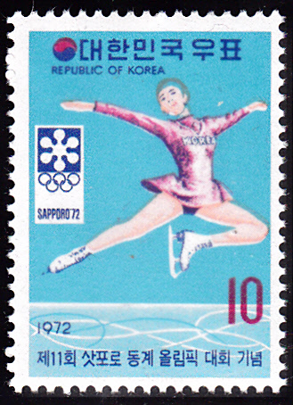 In Korea-Süd erschien zu den Olympischen Winterspielen 1972 diese Marke (MiNr 825) mit einer Eiskunstläuferin.