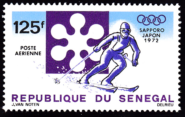 Einen weiteren Abfahrtsläufer zeigt diese Marke aus dem Senegal (MiNr 781).