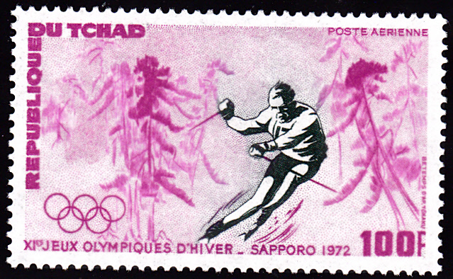 Aus dem Tschad kommt diese Marke (MiNr 487) mit einem Abfahrtsläufer. So wie es aussieht finden im Tschad offensichtlich Abfahrtsrennen mitten im Urwald statt?