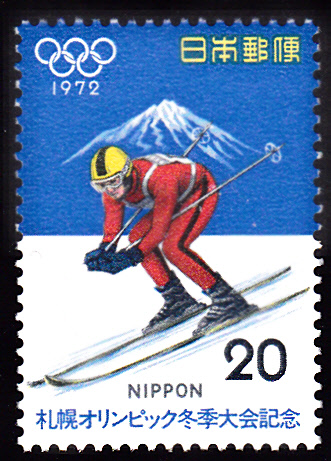 Auf dieser Marke aus Japan (MiNr 1138) zu den Spielen in Sapporo ist ein Abfahrtsläufer zu sehen.