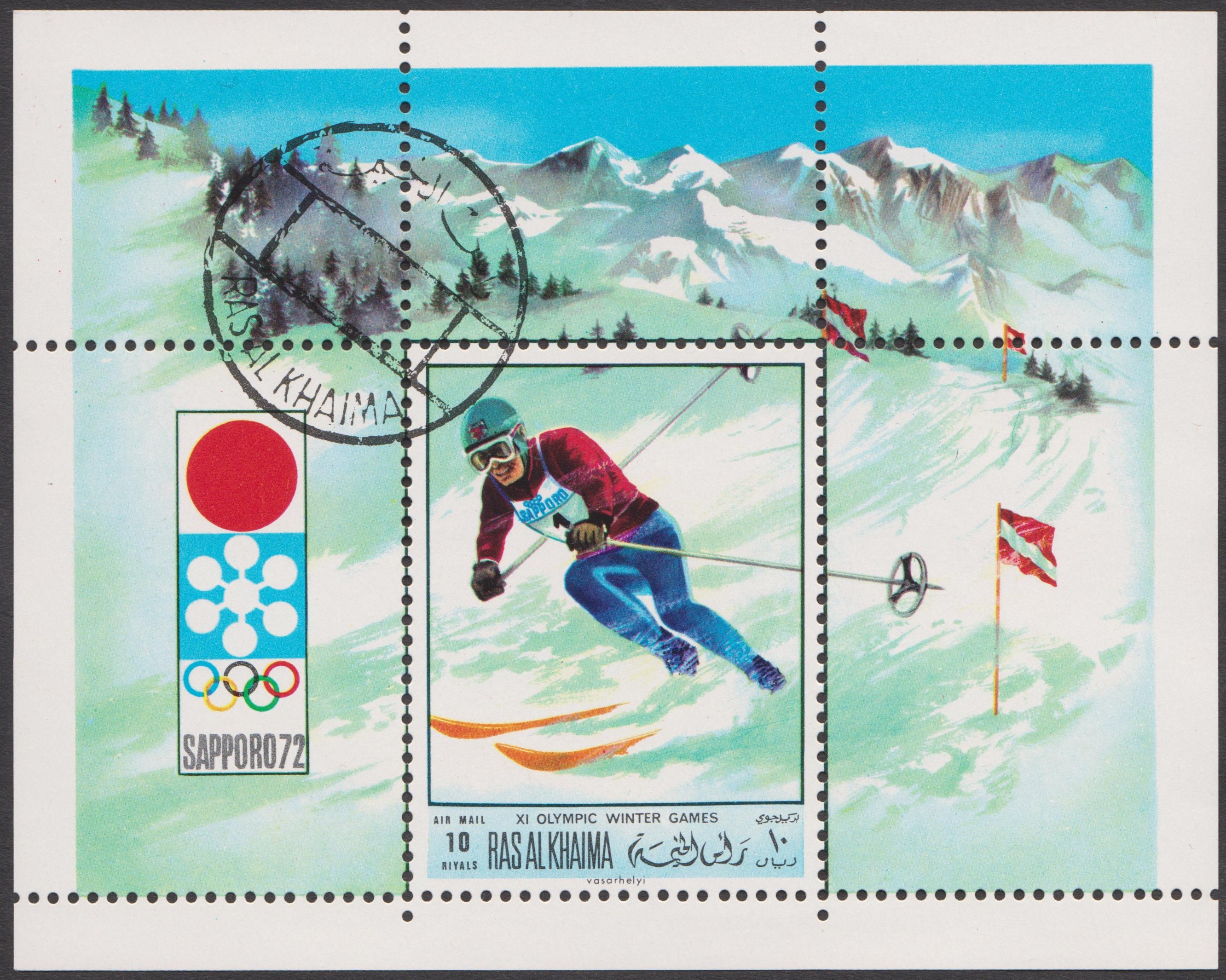 In der Serie aus der Mongolei zu den Spielen in Sapporo zeigt eine Marke (MiNr 670) einen Slalomläufer.