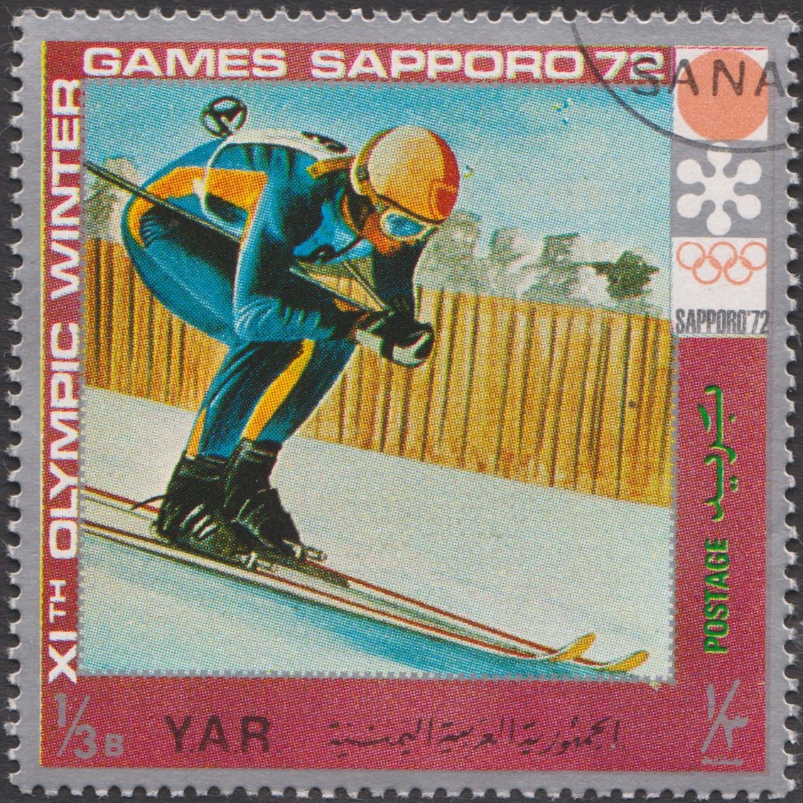 Im Jemen (Nordjemen) erschien am 02.10.1971 dieses Postwertzeichen zum Thema "Skiabfahrtslauf", NiNr. 1440: