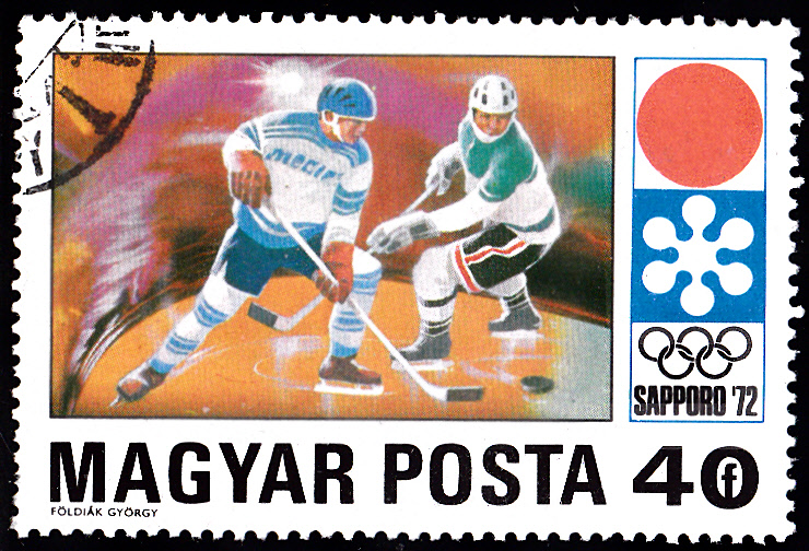 Eine Marke aus Ungarn zu den Olympischen Winterspielen 1972 in Sapporo (MiNr 2720 A) zeigt uns zwei Eishockeyspieler.
