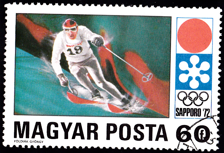 Hier eine Marke aus der Serie Ungarns zu den Winterspielen 1972 (MiNr 2721 A) mit einem weiteren Abfahrtsläufer.