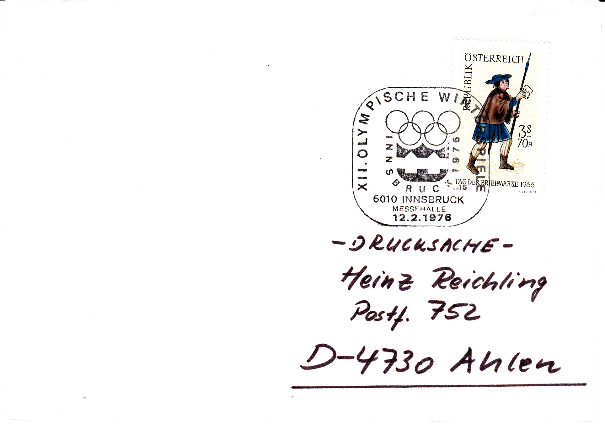 Sonderstempel mit dem Emblem der Olympischen Winterspiele 1976 in Insbruck vom 12.2.1976 mit der Kennziffer "16" auf einer Drucksache nach D-4730 Ahlen. Der hier gezeigte Stempel hat unter dem Ortsnamen den Zusatz "Messehalle" und unterscheidet sich damit von dem einige Beiträge vorher gezeigten Stempel.