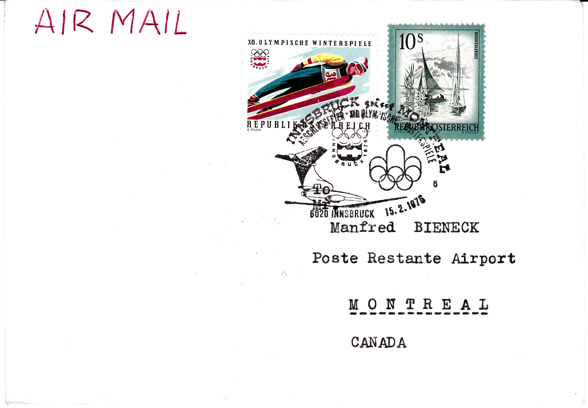 Brief nach Montreal, dem Veranstaltungsort der Sommerspiele 1976 mit Sonderstempel Kennziffer "5" aus Innsbruck vom 15.2.1976 zur Abschlussfeier der Olympischen Winterspiele 1976. Im Text des SST steht "Innsbruck grüßt Montreal".