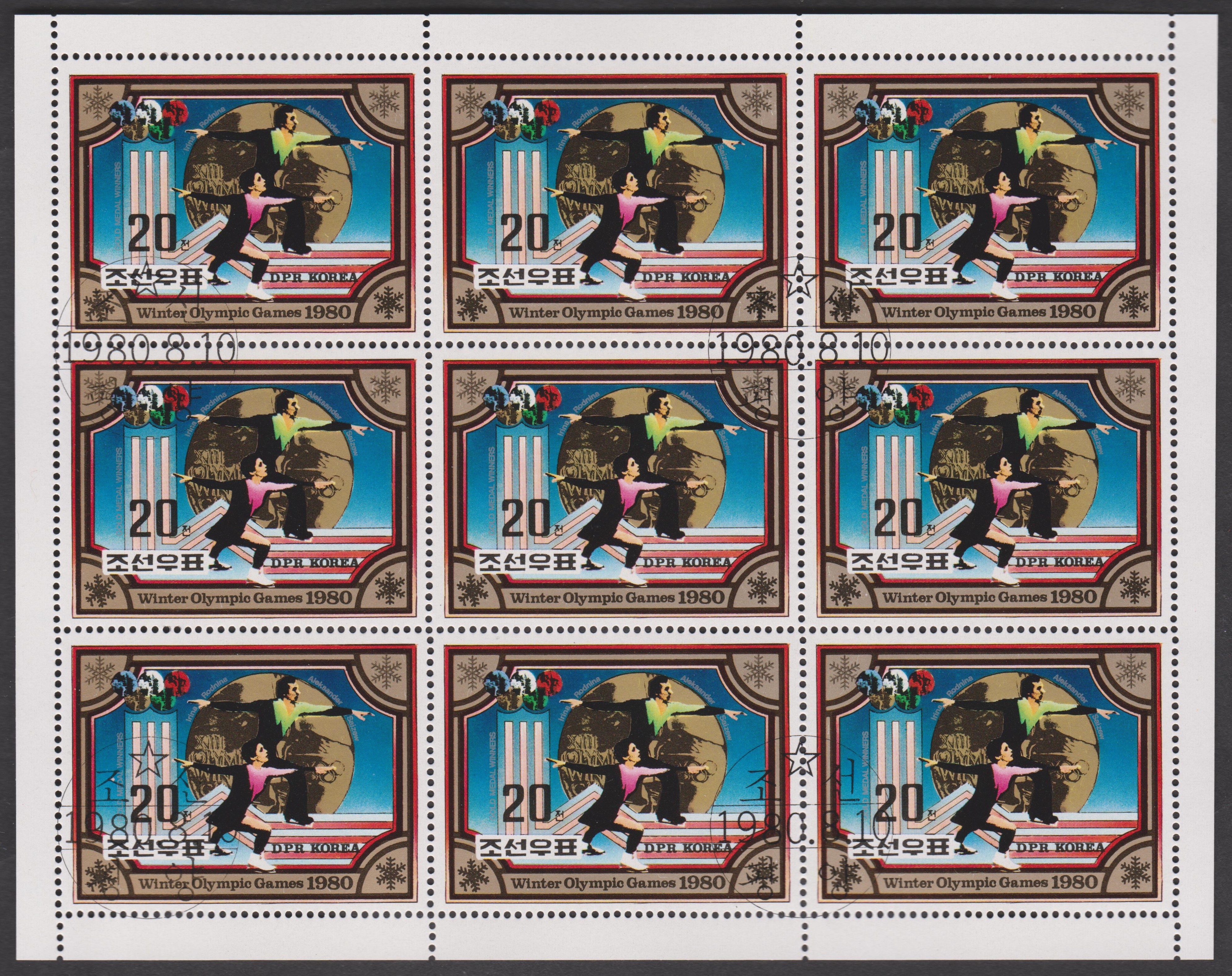 Nordkorea MiNr. 2028, hier im Neuner-Kleinbogen zeigt die Goldmedaillengewinner im Paarlauf der Eiskunstläufer, Irina Rodnina / Alexander Saizew: