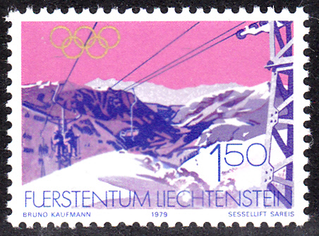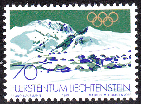 Ende 1979 erschienen in Liechtenstein auch drei Marken zu den Winterspielen 1980. Auf dieser Marke zu 40 Rappen (MiNr 735) wird die Langlaufloipe Valüna gezeigt.
