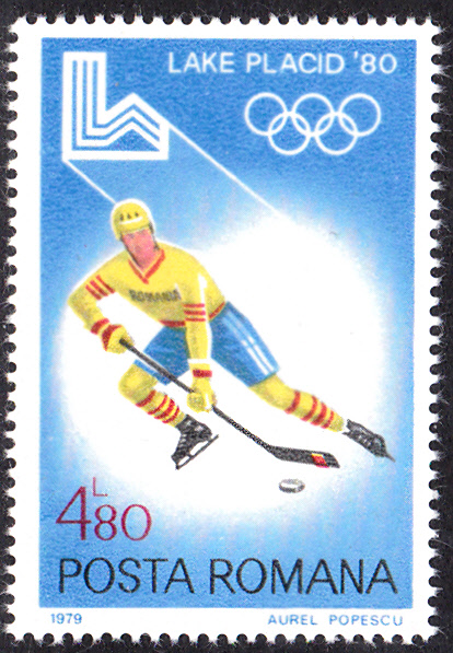 Die letzte Marke der rumänischen Serie (MiNr 3671) zeigt einen Eishockeyspieler im rumänischen Trikot.