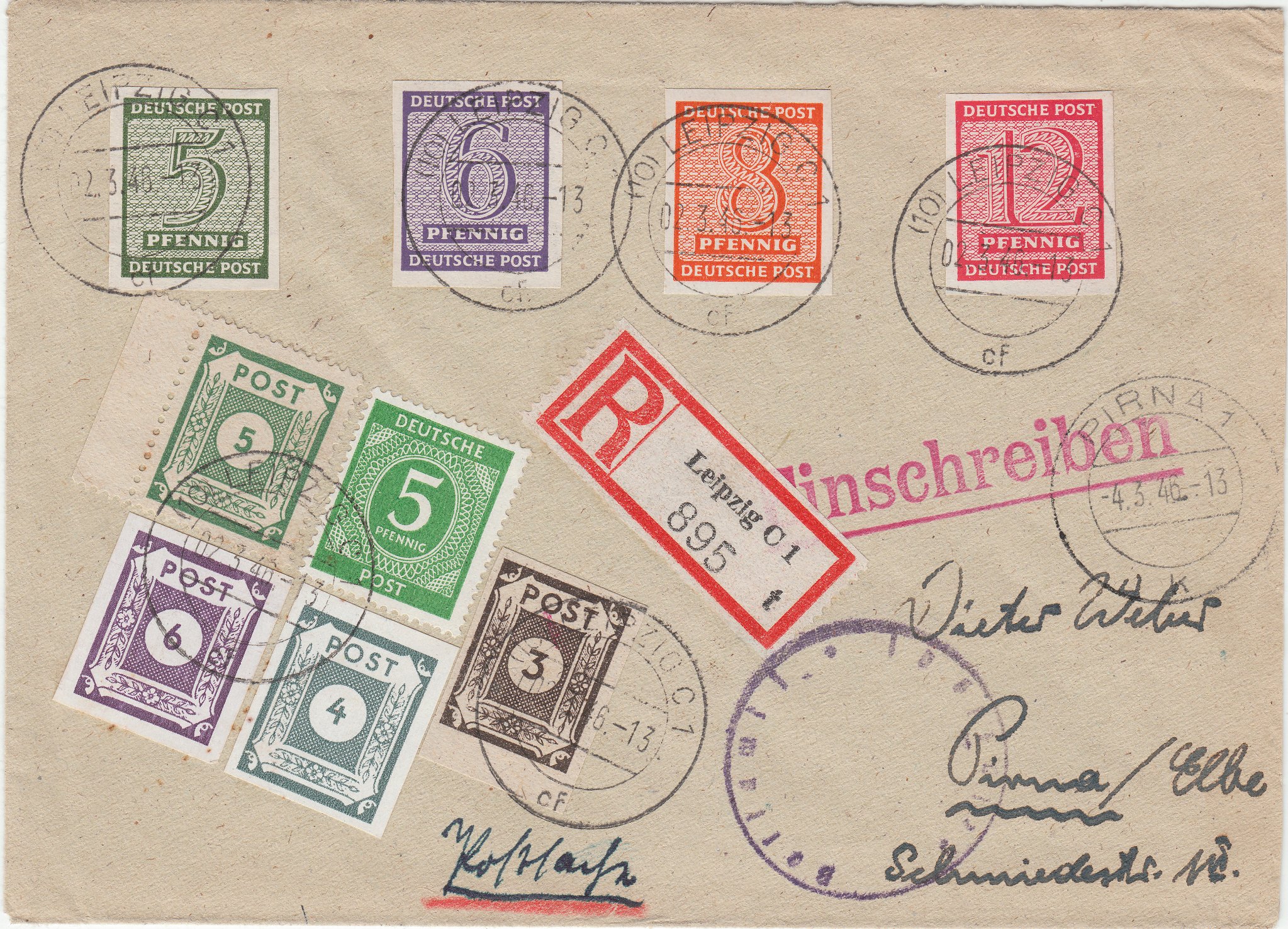 Der Beleg traf ohne entsprechende Beanstandung am 04.03.1946 beim Bestimmungspostamt Pirna an, was ein Tagesstempel als Ankunftsstempel dokumentiert.