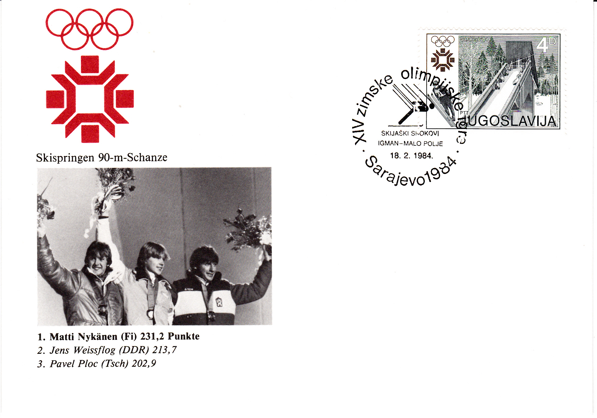 Sonderstempel aus Sarajewo vom 18.2.1984 zu dem an diesem Tag stattfindenden Wettbewerb im Skispringen von der Großschanze.