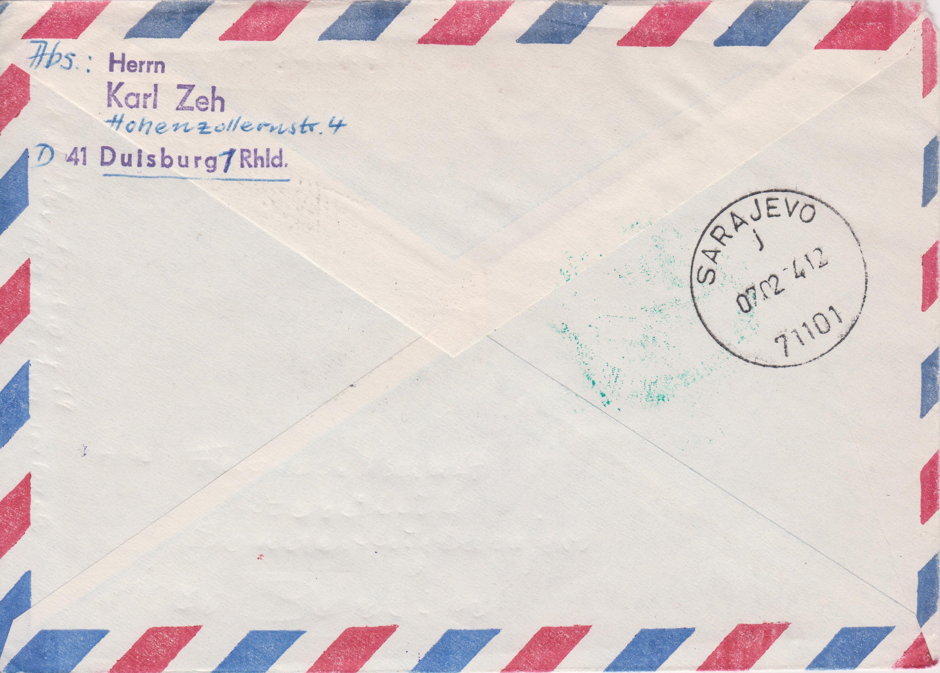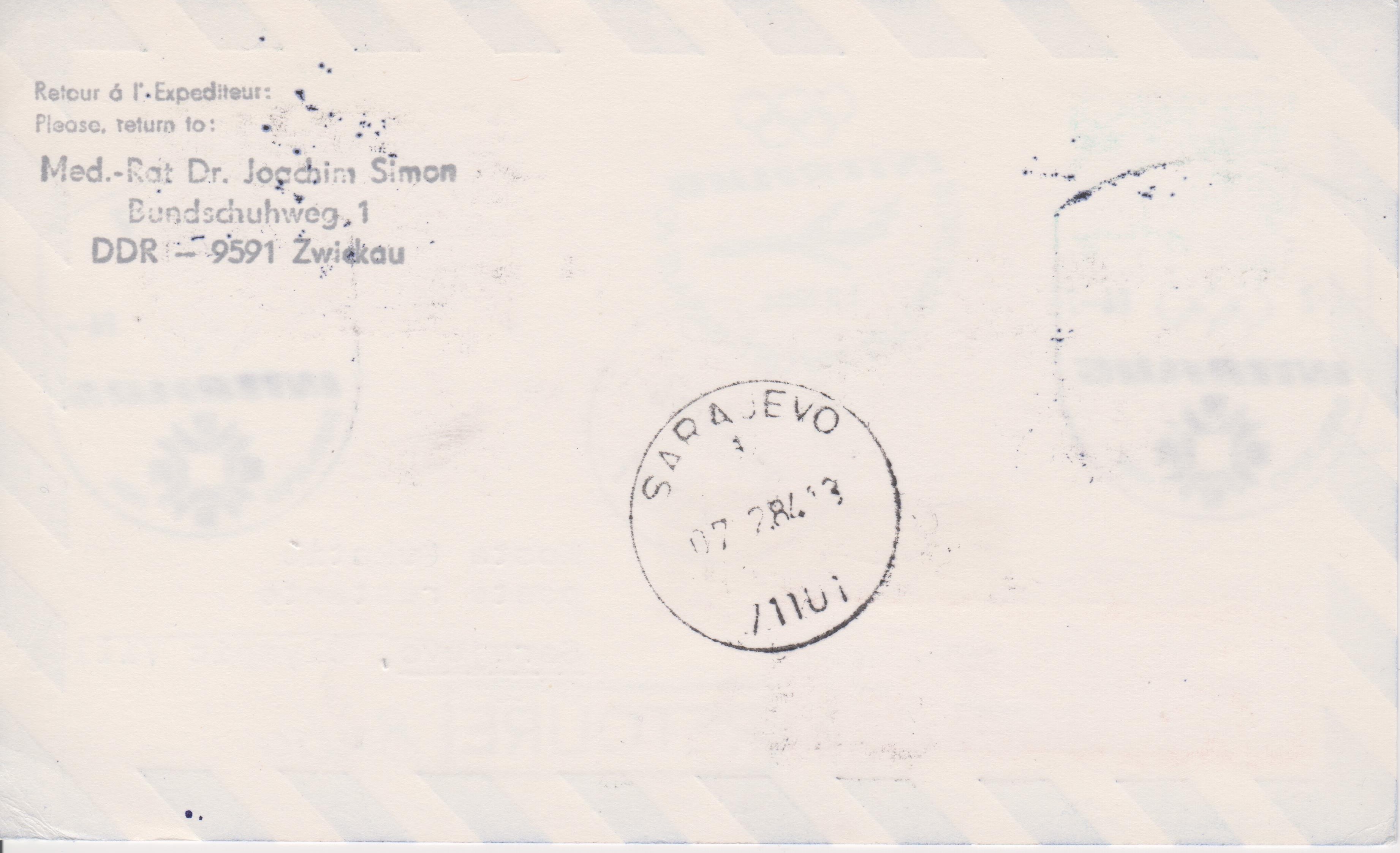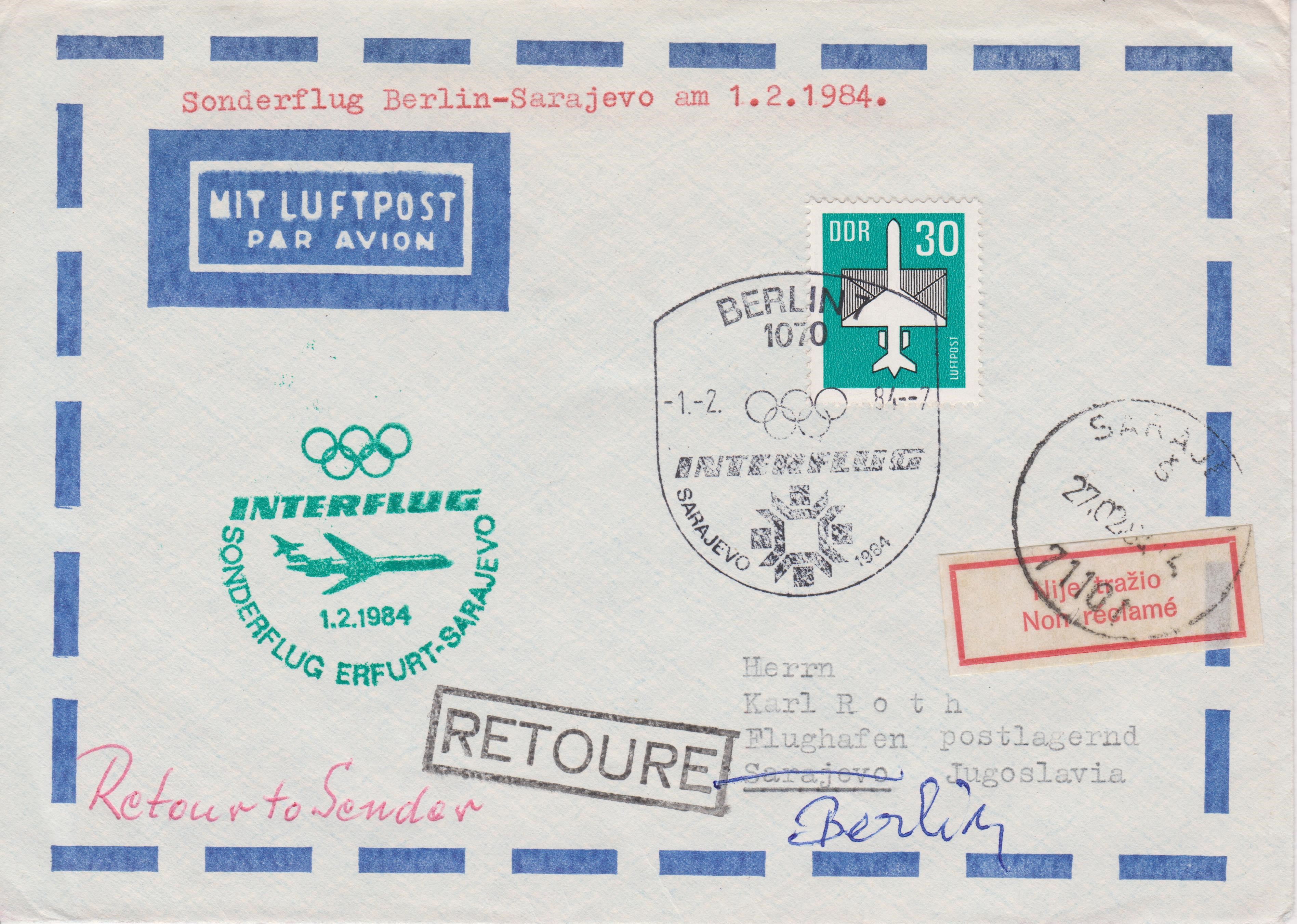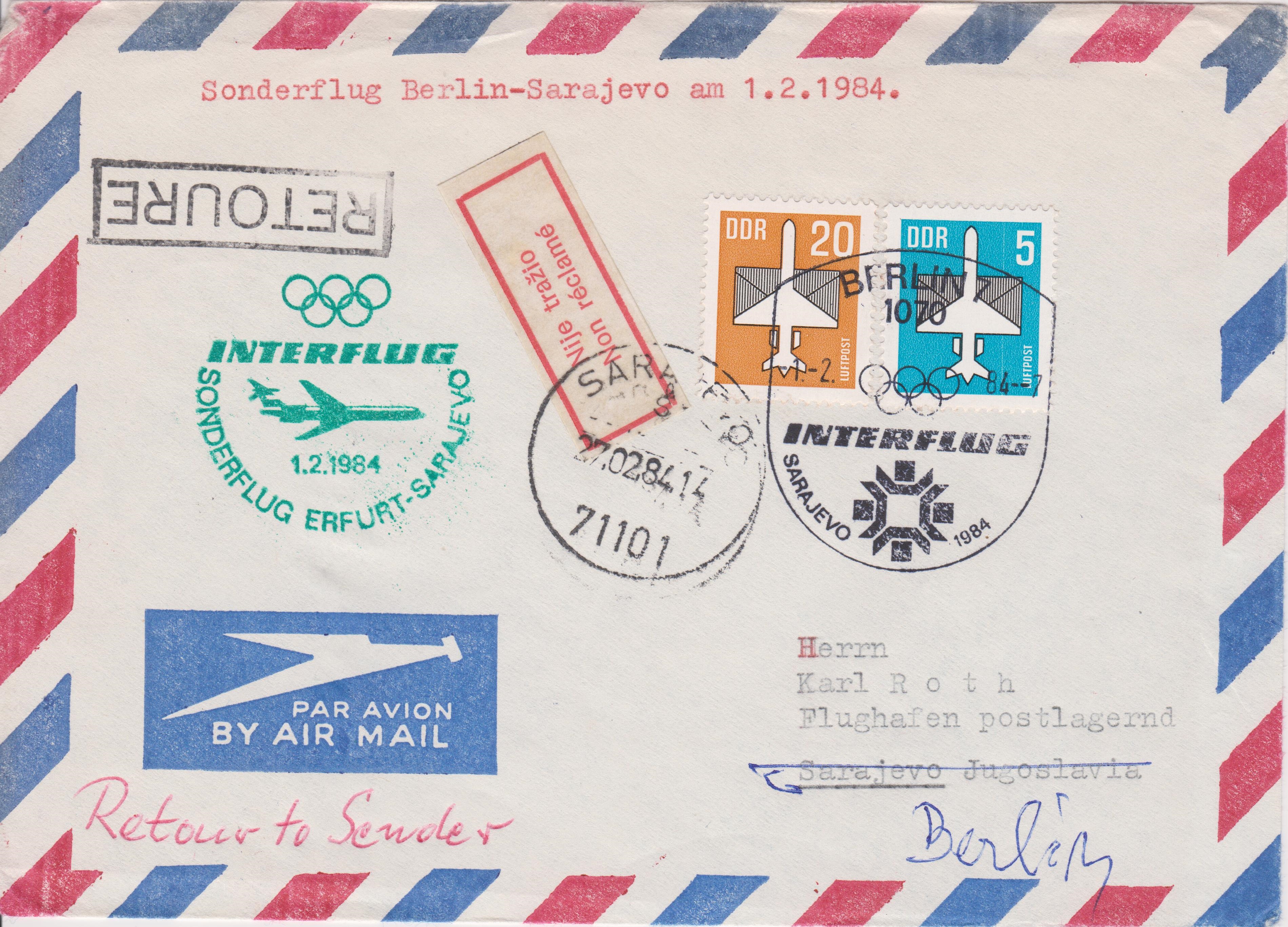 Diese per Luftpost beförderten Belege dokumentieren den INTERFLUG SONDERFLUG ERFURT - SARAJEWO am 01.02.1984: