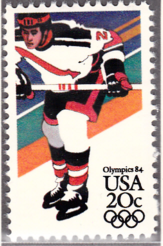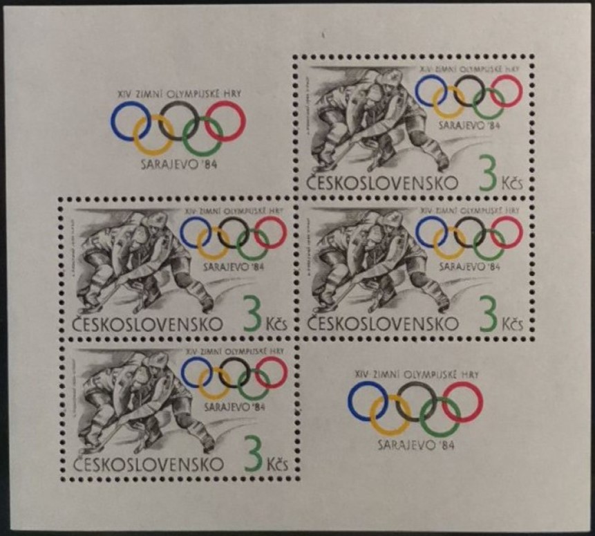 In der Tschechoslowakei ist zu den Winterspieken 1984 eine Marke mit einer Spielszene beim Eishockey (MiNr 2752) erschienen. Diese gibt es aus dem Bogen oder einer Blockausgabe. Hier zeige ich ein Marke aus einem Block (MiNr Block 57), zu erkennen an den noch vorhandenen Blockränder.