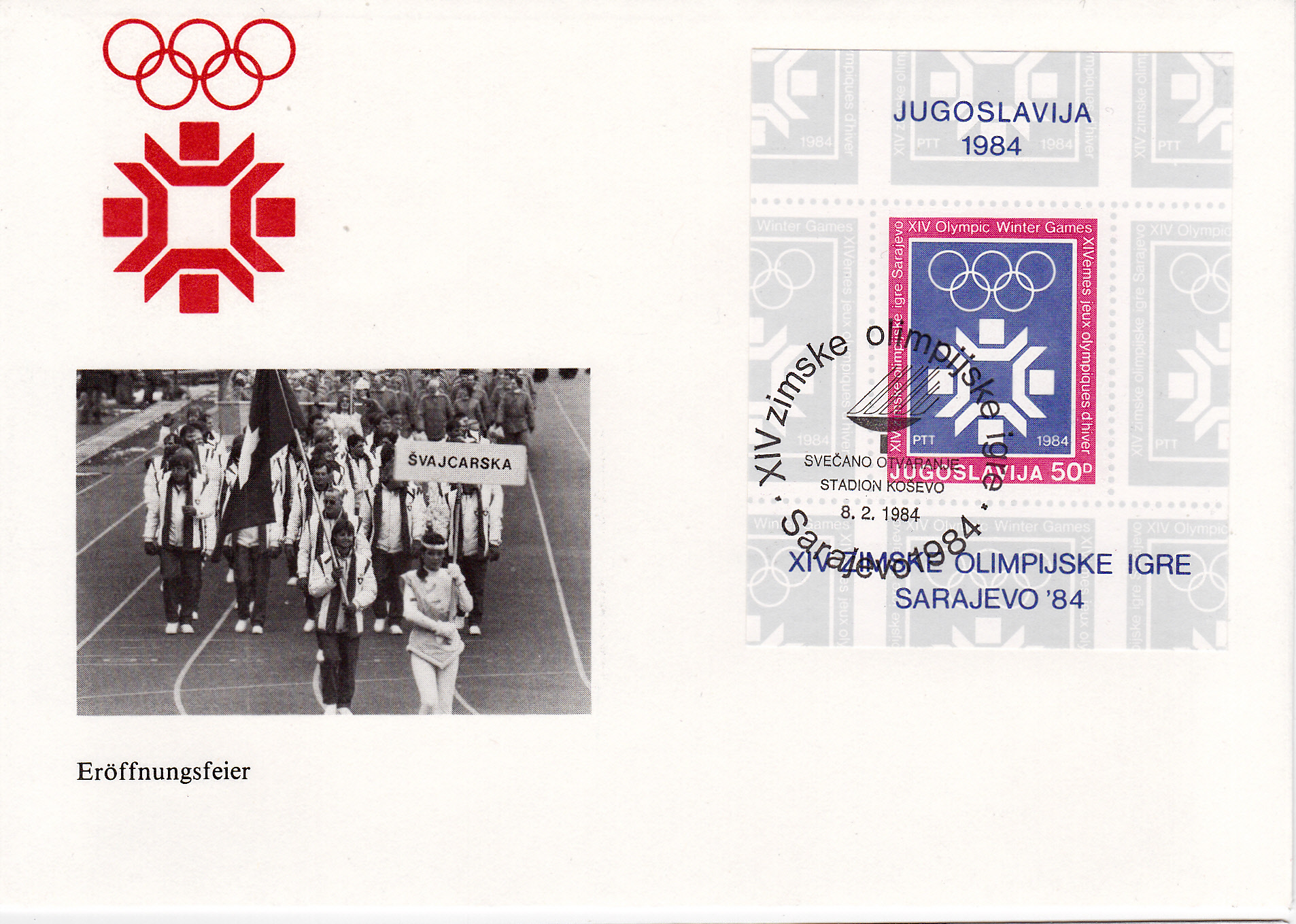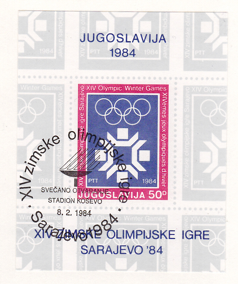 Sonderstempel aus Sarajewo zur Eröffnungsfeier der Olympischen Winterspiel 1984 am 8.2.1984 mit dem Olympischen Feuer im Stempelbild auf dem Block MiNr Block 22.