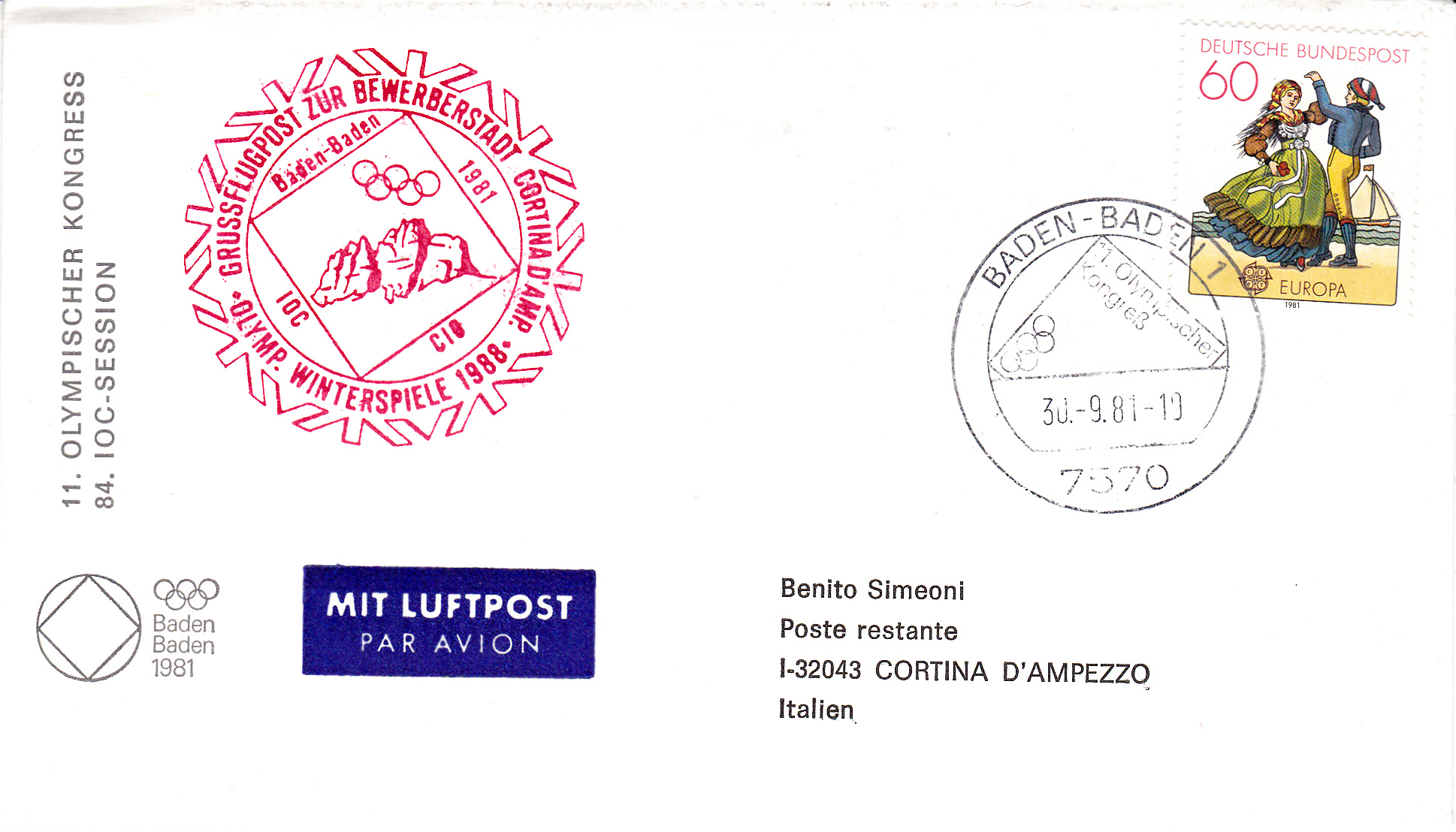 Sonderstempel vom 30.9.1981 aus Baden-Baden auf einem Brief als Grußpostflugpost nach Cortina d'Ampezzo. Das Porto betrug wie bei einem Inlandsbrief in die Cept-Länder 60Pf und es war kein Luftpostzuschlag erforderlich. Rückseitig ist ein Ankunftsstempel vom 3.10.1981.