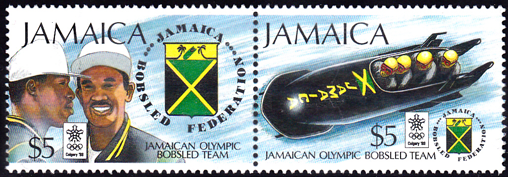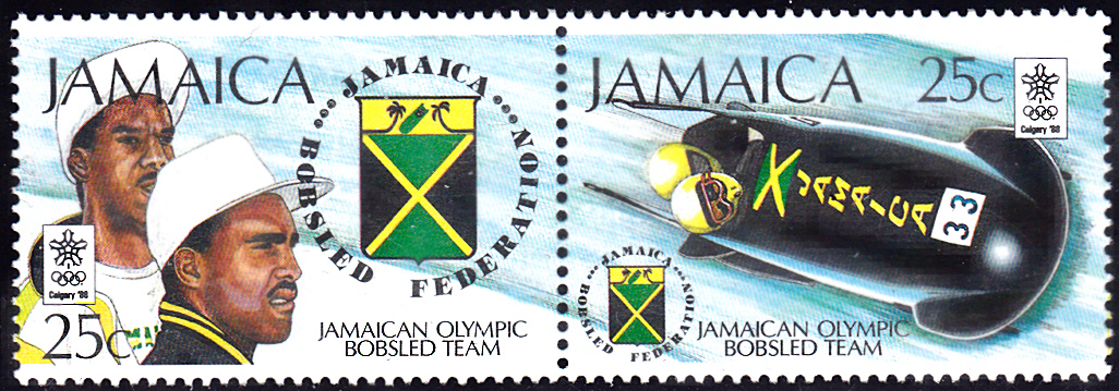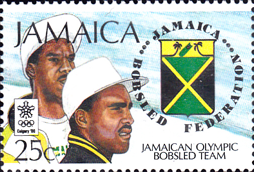 Zur Teilnahme der Bobmannschaft aus Jamaika erschien auf Jamaika eine Markenserie. Hier zeige ich eine Marke (MiNr 706) mit zwei Bobfahrer aus Jamaika (vermutlich die beiden Starter beim Zweierbob Dudley Stokes und Michael White).