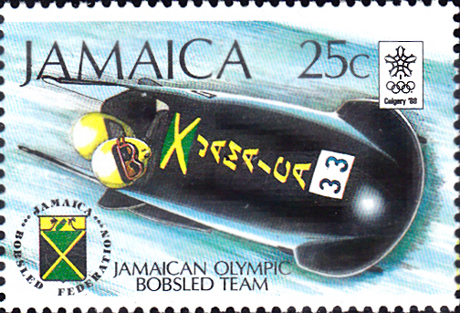 Diese Marke aus Jamaika (MiNr 707) zeigt den Jamaikanischen Zweierbob.