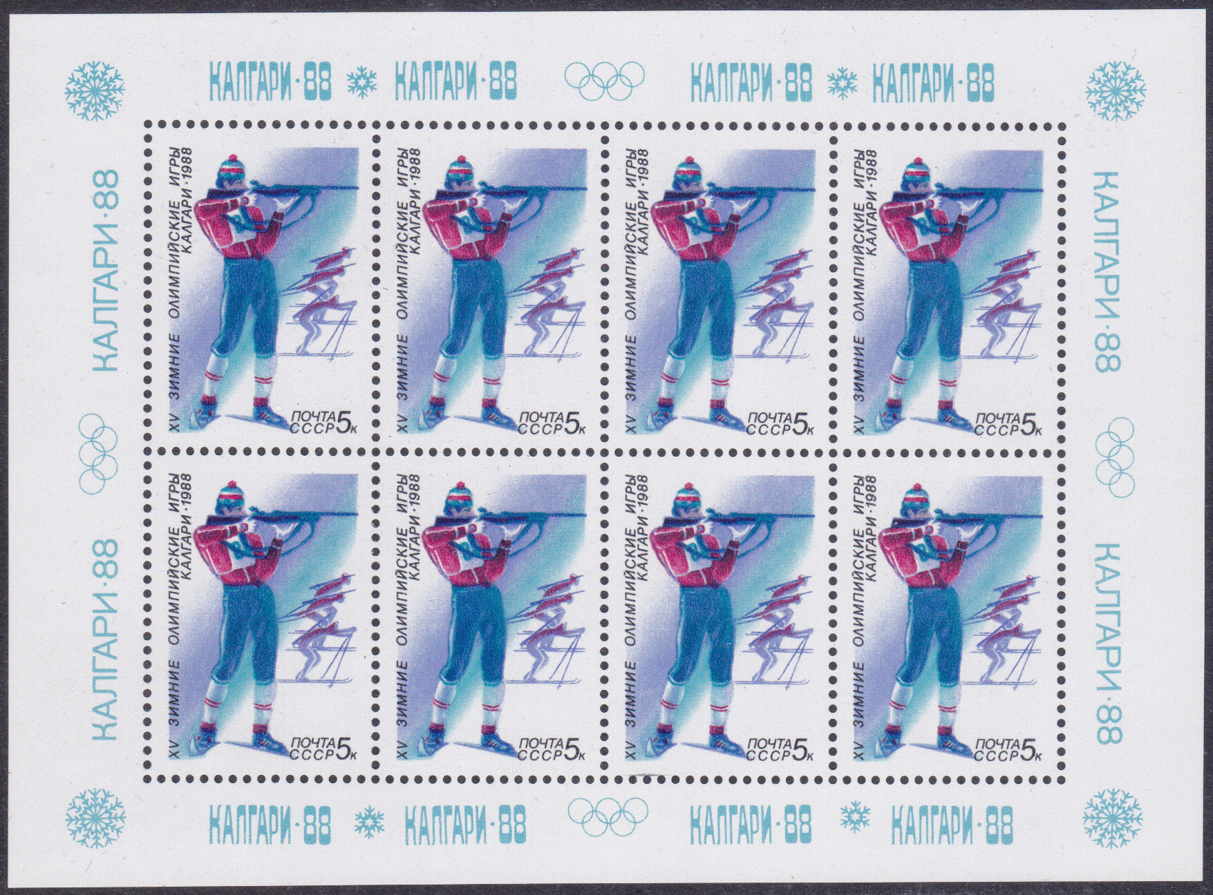 In einer Serie zu den Spielen in Calgary erschien eine Marke zu 5 Kopeken (MiNr 5788) mit einem Biathleten beim Stehend Schießen. Die Marke wurde in Bögen zu 50 Marken und im Kleinbogen zu 8 Marken gedruckt. Hier zeige ich den selteneren Kleinbogen.