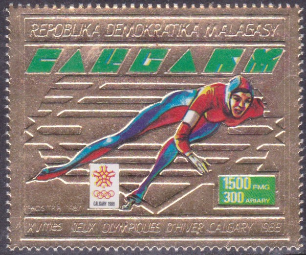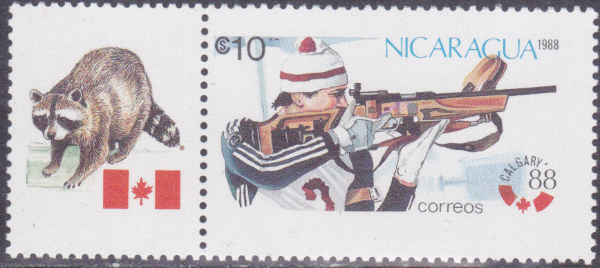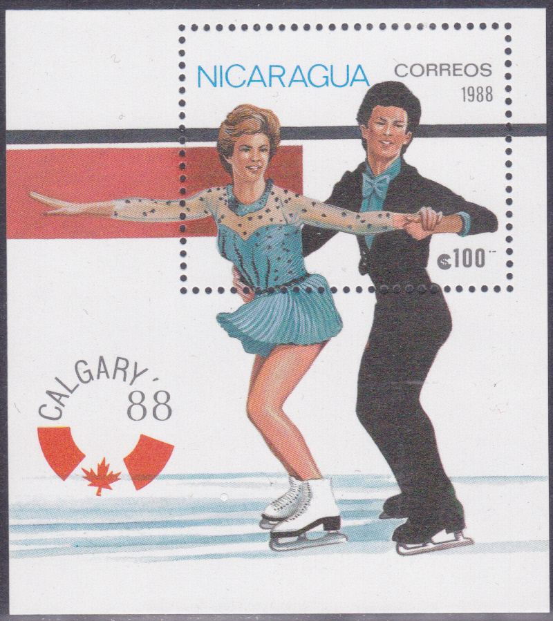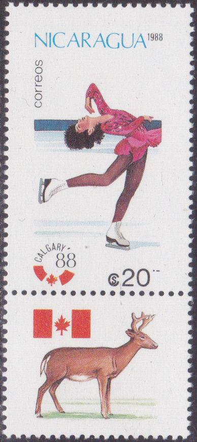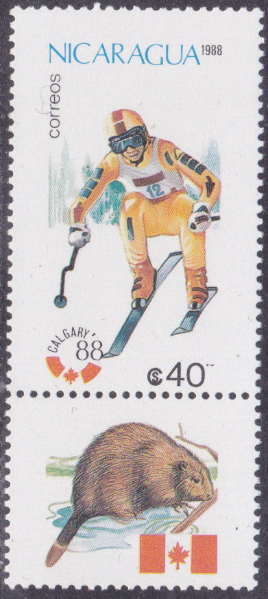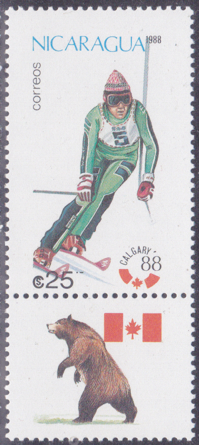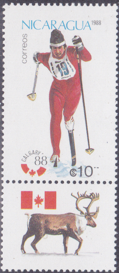 In Nicaragua ist in einer Serie zu den Olympischen Winterspiele 1988 diese Marke (MiNr 2843) mit einem Skilangläufer erschienen. Die Marken der Serie wurden jeweils mit einem Zierfeld zusammenängend gedruckt. Hier zeige ich eine Marke mit dem Zierfeld.