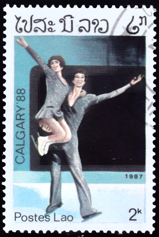 Es folgt eine Marke aus Laos (MiNr 967) mit einem Paar beim Eiskunstlauf.
