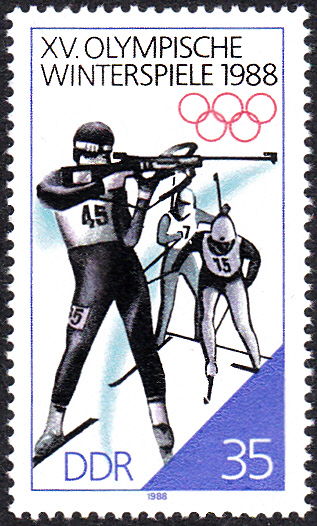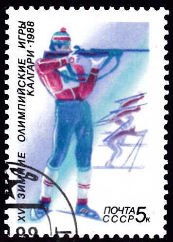Aus der Serie zu den Winterspielen 1988 der Sowjetunion kann ich hier die Marke zu 5 Kopeken (MiNr 5788) mit einem Biathleten beim stehend Schießen zeigen.