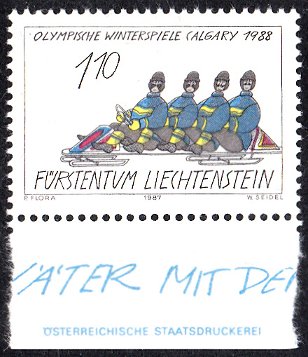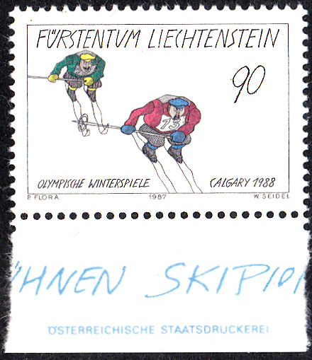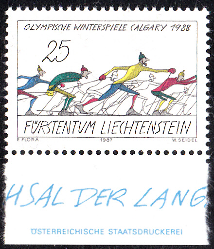 In Liechtenstein erschien zu den Olympischen Spielen in Calgary eine Serie mit drei Marken mit Zeichnungen von Paul Flora (1922-2009, österreichischer Graphiker, Karikaturist und Illustrator). Hier die Marke zu 25 Rappen (MiNr 934) mit der Zeichnung "Die Mühsal der Langläufer".