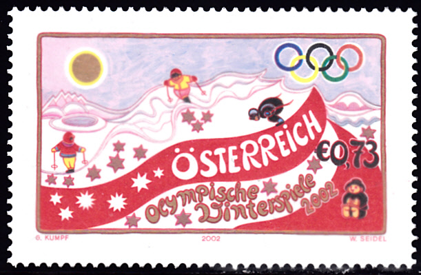 Aus Österreich kommt diese Marke (MiNr 2369) mit einem Skifahrer nach einem Gemälde von Gottfried Kumpf (geb.1930).