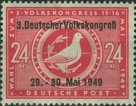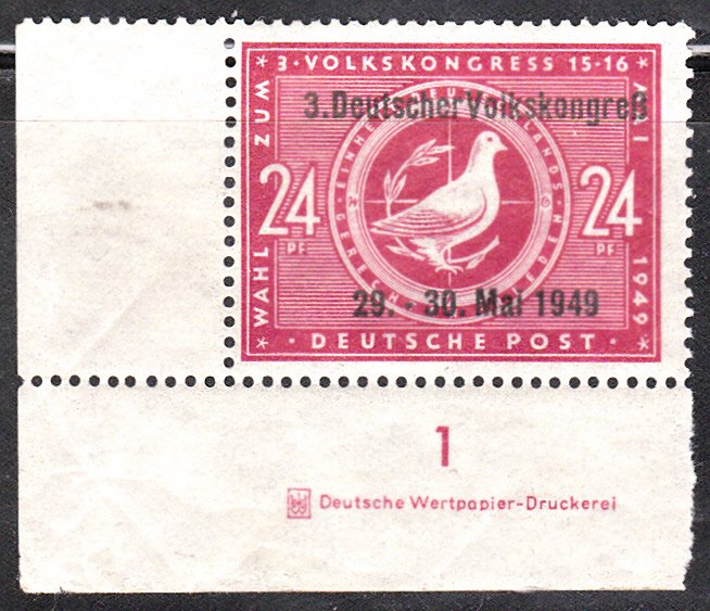 Am 29.5.1949 erschien zur Tagung des 3. Volkskongresses die Marke zu den Wahlen zum 3. Volkskongress mit schwarzem Buchdruck-Aufdruck. Es gibt hier zwei Aufdrucktypen. Hier eine Marke mit dem Aufdrucktyp I als Eckrandstück mit Druckvermerk (MiNr 233 I DZ).