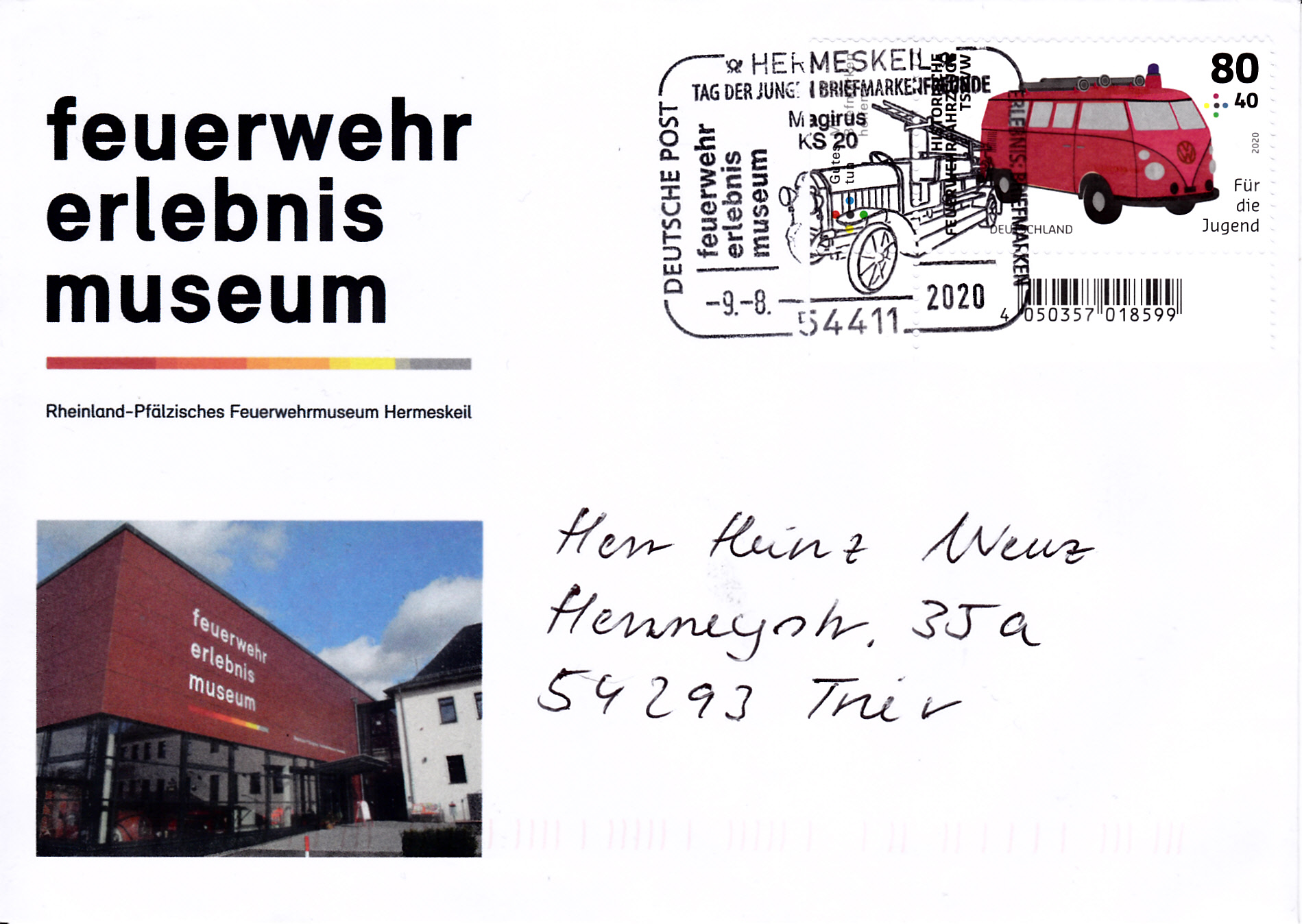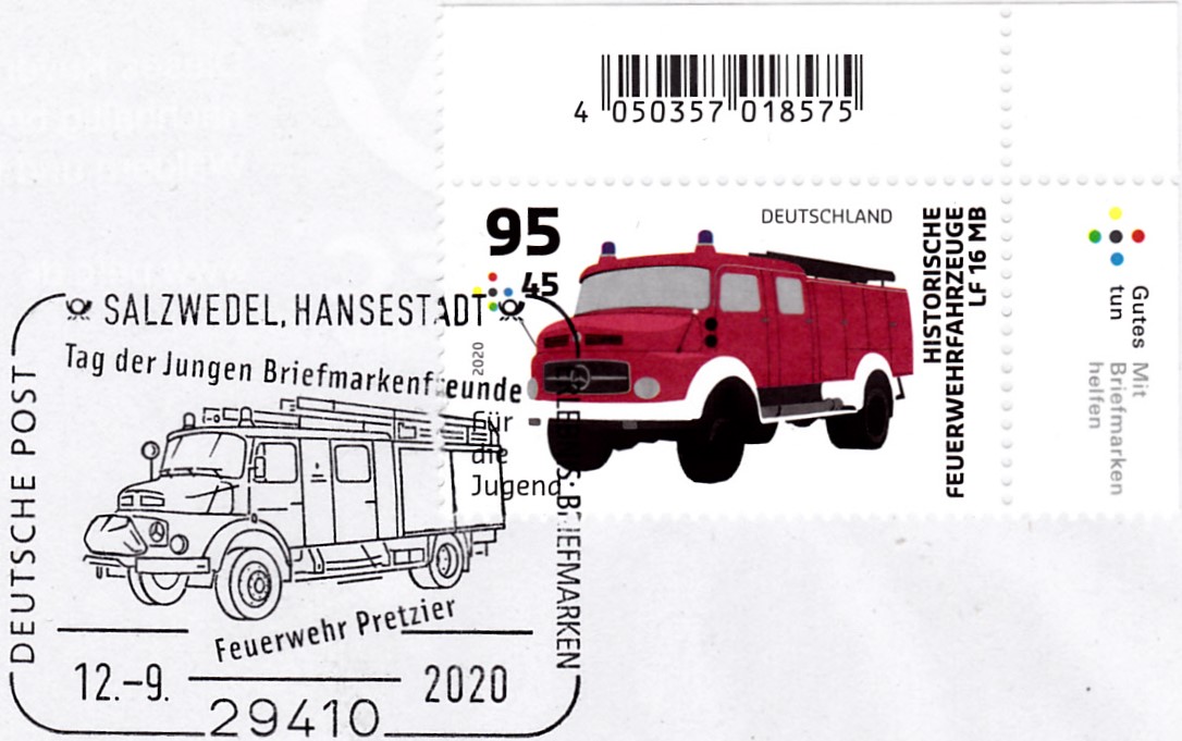 In Salzwedel wurde zum Tag der Jungen Briefmarkenfreunde am 12.9.2020 ein Sonderstempel mit einem Feuerwehr Löschfahrzeug "LF 16 MB" passend zur Marke zu 95+45 Cent verwendet.