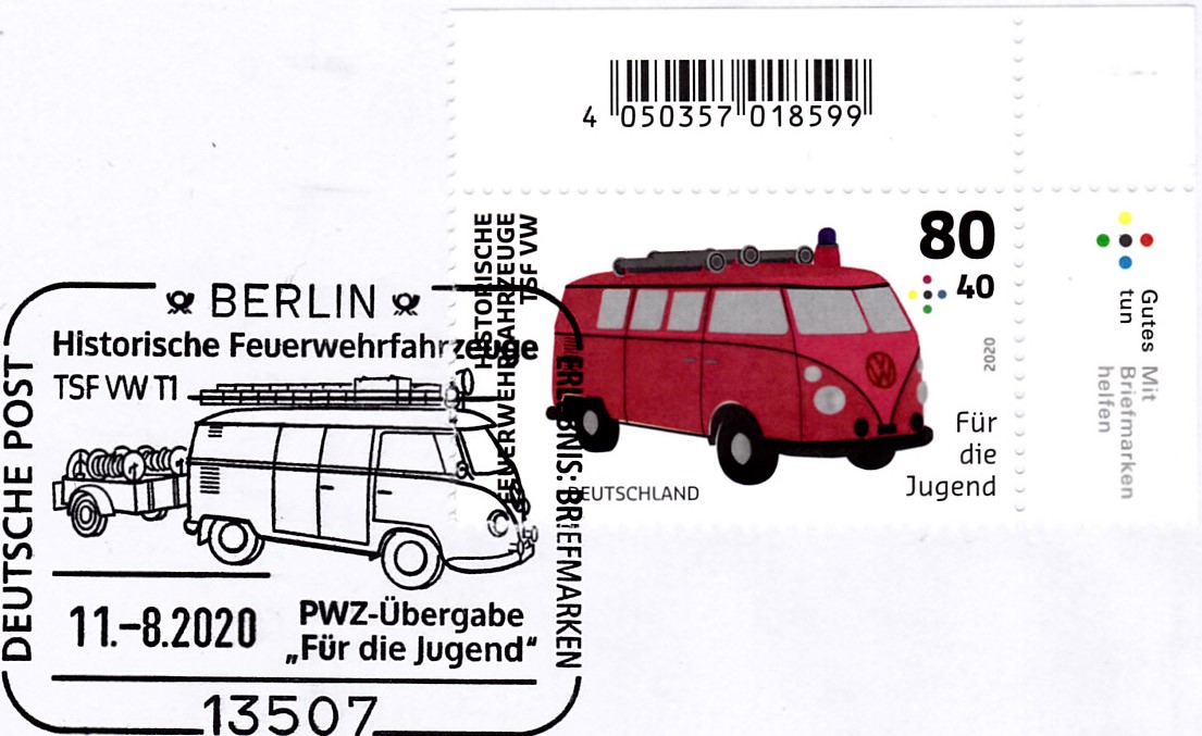 Zur Übergabe der Jugendmarke 2020 im Feuerwehrmuseum Berlin wurde dieser Sonderstempel am 11.8.2020 mit einem Feuerwehrauto TSF VW T1 verwendet.