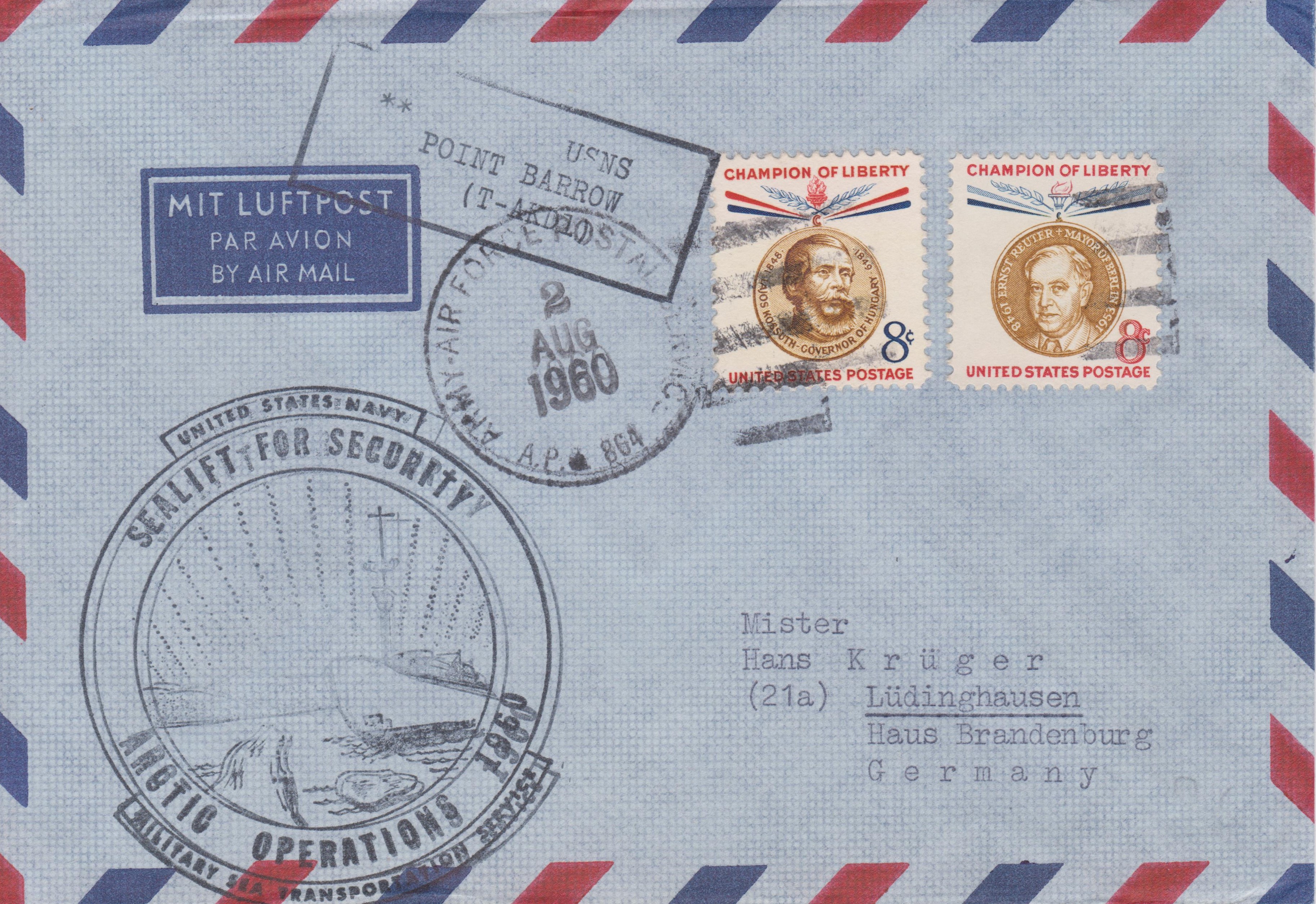 Dieser nach Lüdinghausen adressierte Brief wurde am 02.08.1960 aufgegeben auf der USNS POINT BARROW (T-AKD1):