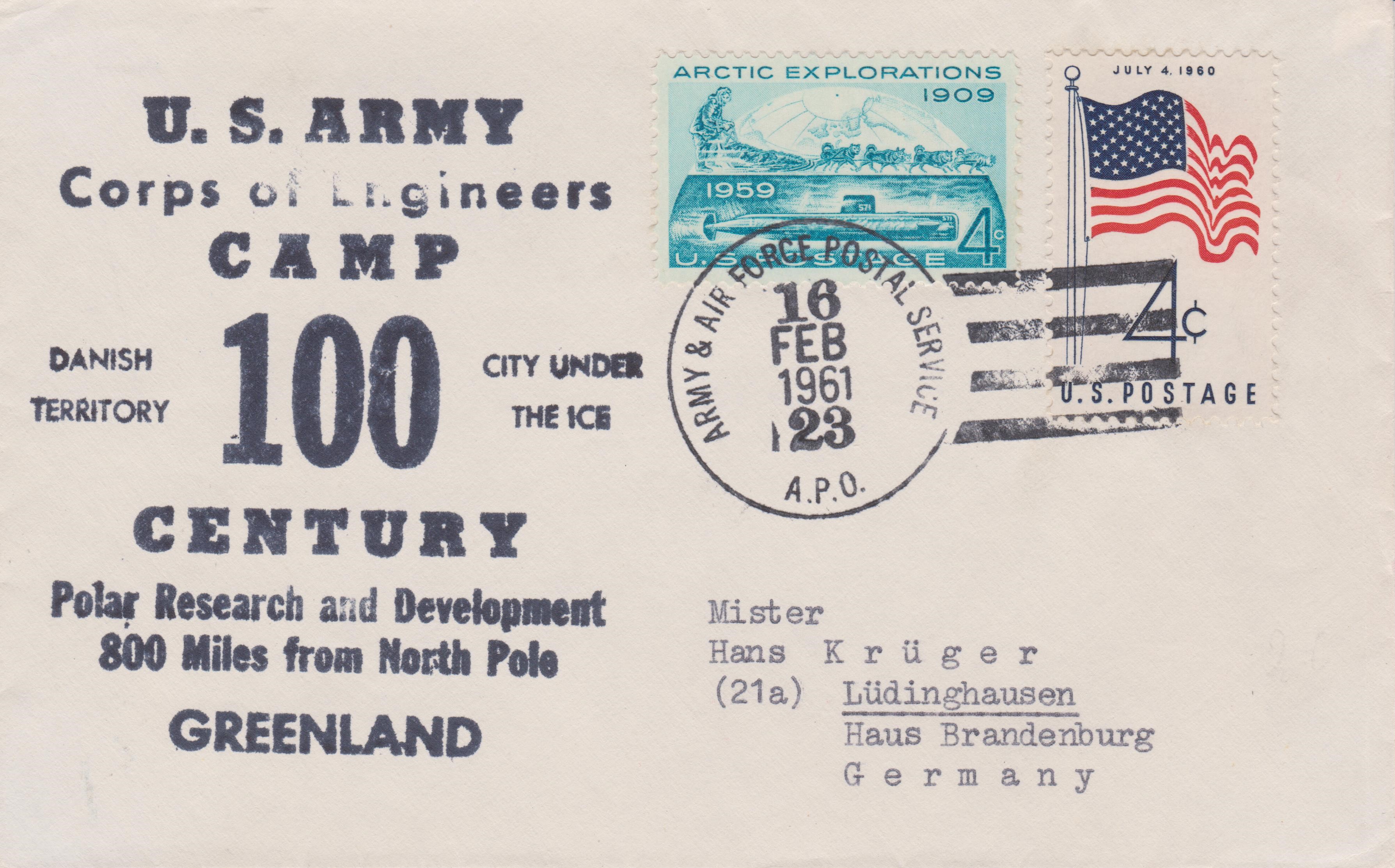 Dieser Beleg vom 16.02.1961 dokumentiert "CAMP 100 CENTURY" als "CITY UNDER THE ICE":