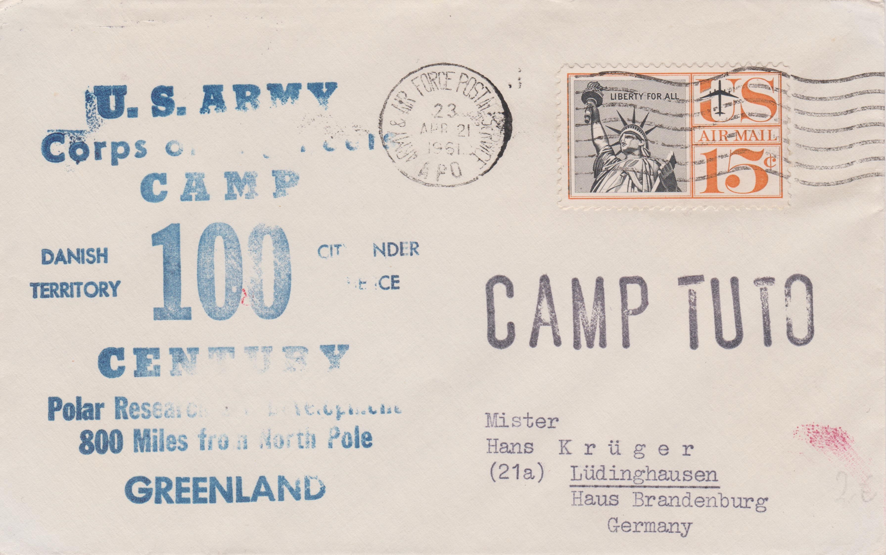 Dieser Beleg vom 21.04.1961 dokumentiert "CAMP 100 CENTURY" als "CITY UNDER THE ICE" sowie einem zusätzlichen Stempel "CAMP TUTO":