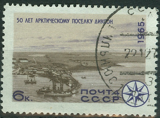 Diese CCCP-Marke aus dem Jahr 1965 (MiNr. 3127) zeigt anläßlich des 50. Gründungsjubiäums der arktischen Siedlung Dikson, einen territorialen Ausschnitt dieses Teils der Arktis.